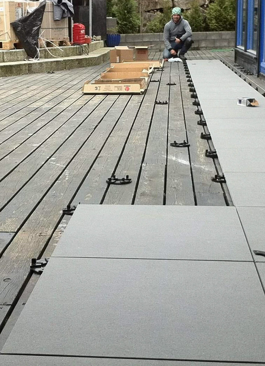 Jag gillar inte riktig den här lösningen men undrar om man skulle behöva täta fogarna mellan plattorna så att inget vatten rinner in i isoleringen ovanifrån. Jag tror ju det men jag vet inte om/hur det går att göra. Tanken med det systemet verkar ju vara att man lätt kan ta upp plattorna.