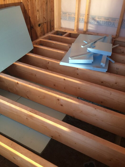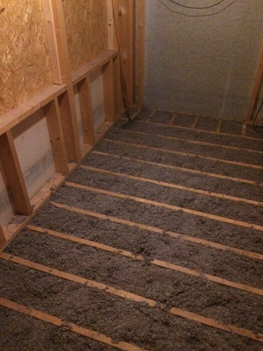 Jag har dock ingen krypgrund för att sätta dessa, eller ens plats för att spika elle skruva underifrån bjälklaget, så de kanske behöver sättas mellan reglarna. Kanske det är bättre att använda cellplast istället)