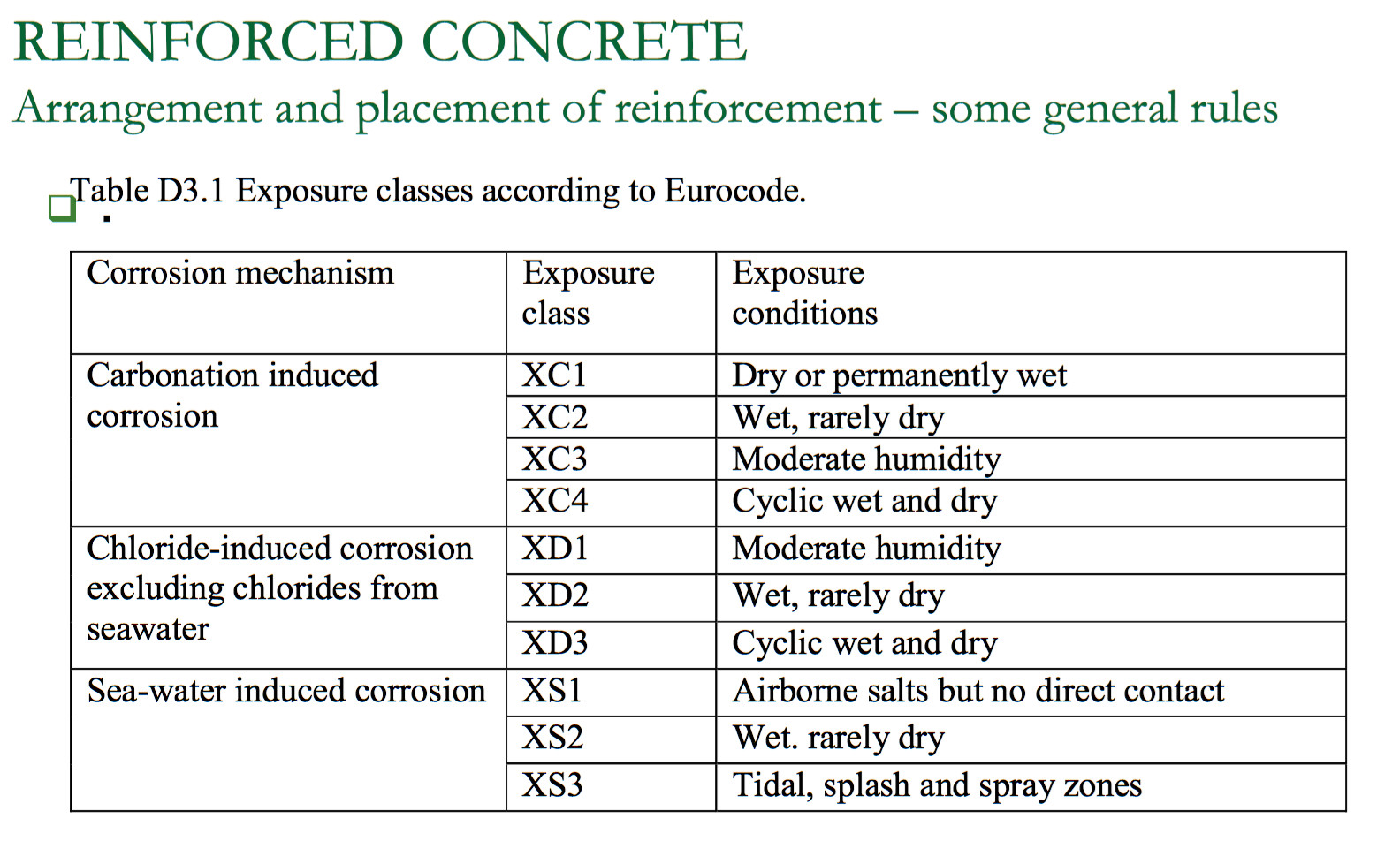 Så om en garageplatta är klass XC1 och man vill ha en beräknad livslängd på 50 år då skall betongtäckningen vara 10 mm, vill man ha en livslängd på 100 år så skall den vara på 15/10 mm (beroende på vct).