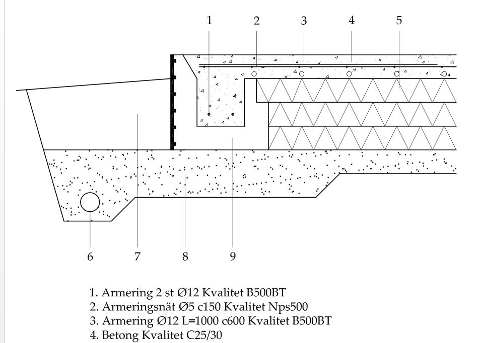 Däremot borde du lägga kantavstyvningsjärn runt plattan, 12 mm enmetersjärn på cc 600, vinkelrätt mot kantbalken. Detta för att förhindra att balken vrider sig loss från plattan vid last.