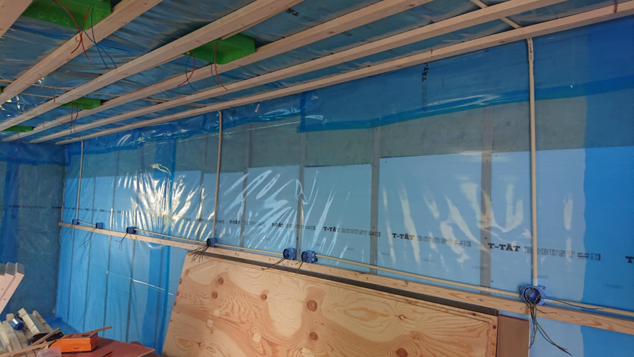 Därefter en bild lite senare, när jag har isolerat mot betongen med cellplast och med minerallull ovanför. (Där sitter vindpapp på utsidan, jag kunde inte köra utegips ovanför betongen, eftersom det byggde för mycket.) Sedan har jag plastat det med diffplast på insidan. Det rådde lite delade meningar om det, men en person som jag generellt litar på i byggfrågor tyckte jag skulle göra så eftersom det fanns risk för viss fuktvandring med hänsyn till att betongen inte går hela vägen upp. Man ser även den första av de liggande 45