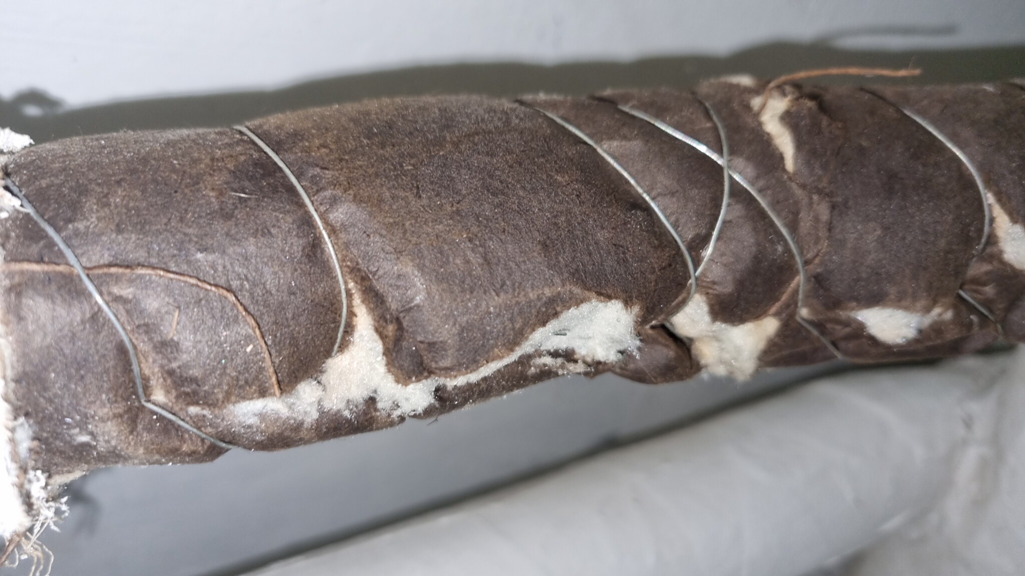 Är det någon som har en bra ide vad detta kan vara för isolering? Hur stor är risken att det är asbest i? Brunt isoleringsmaterial runt ett rör, inlindat med metalltråd, med vita fibrer synliga vid sprickor.