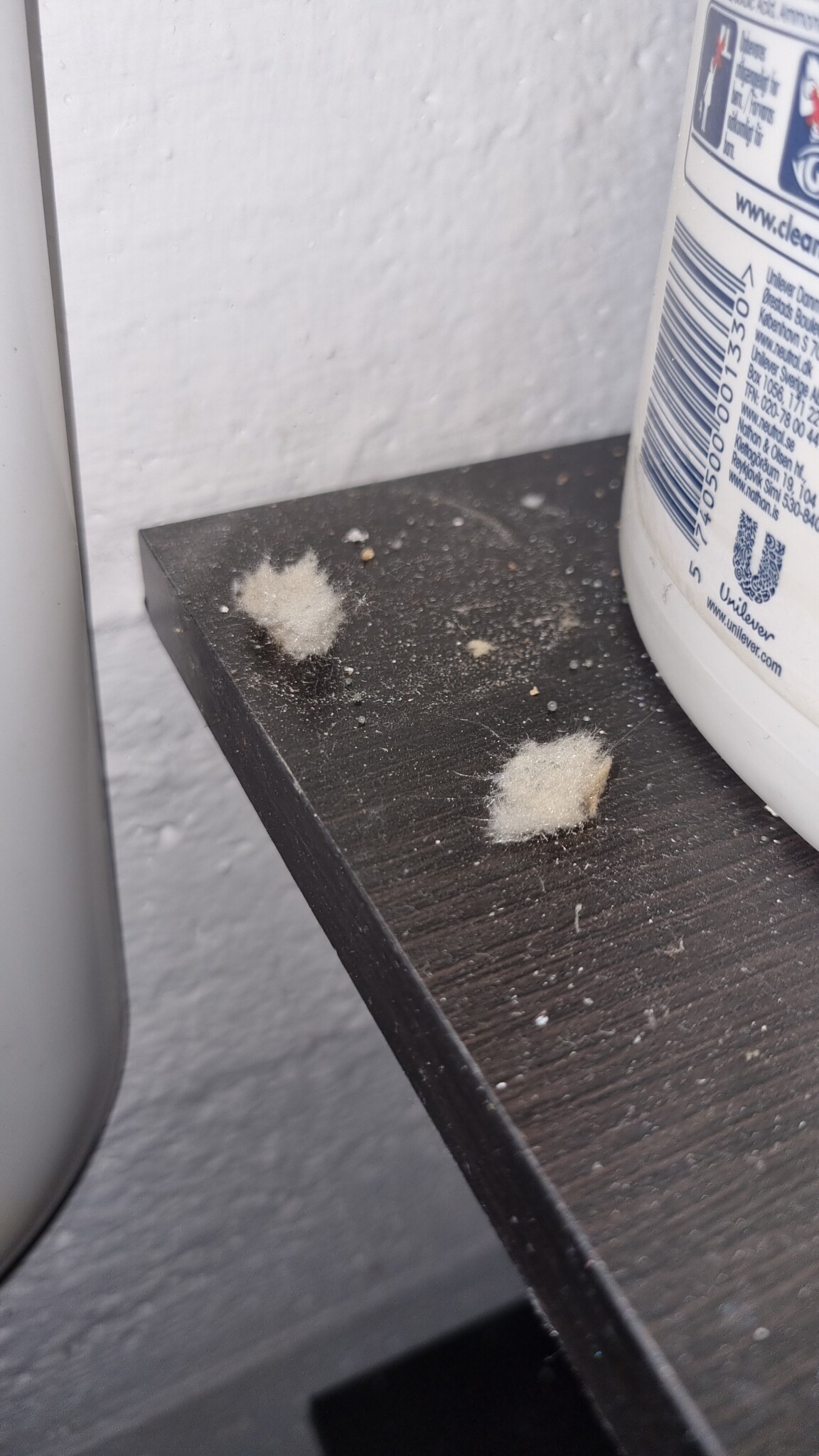 Tussar av vit och brun isoleringsmaterial på en svart hylla nära en plastbehållare.
