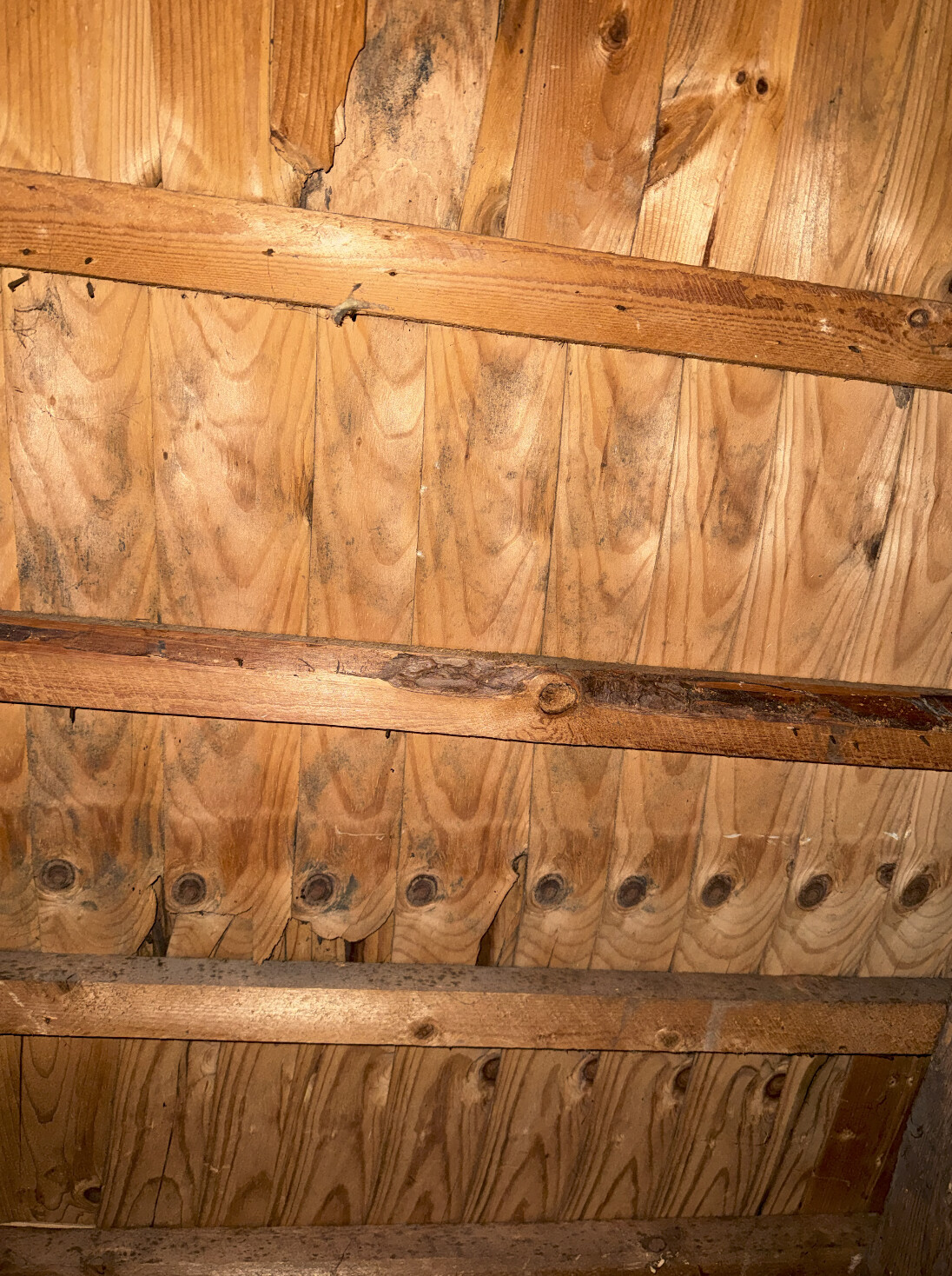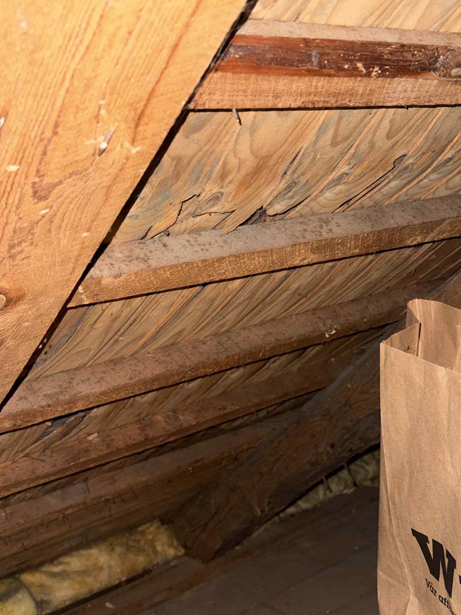 Det finns inga ventiler alls på vinden, varken kattvinden eller nockvinden. Och takfoten är ganska tät, man ser springor ut bara. Mäter jag med fuktmätaren så är det typ 12-13% fukt i träet.