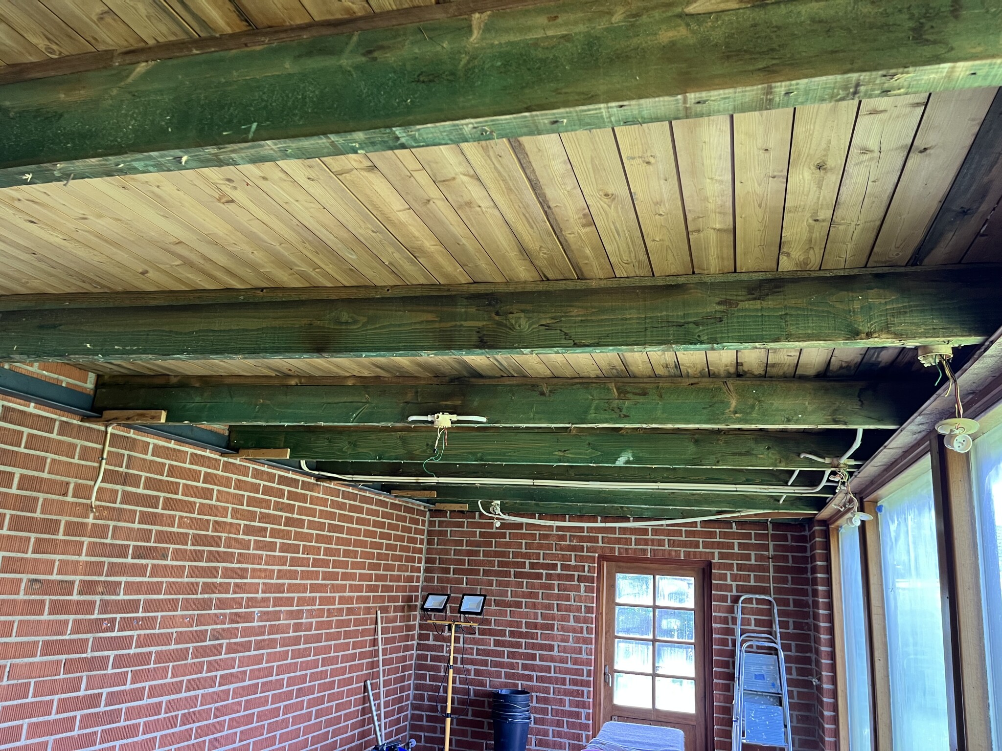 Rev ner innertaket och den gamla isoleringen för att komma åt och dra nya el och gipsa innertaket.