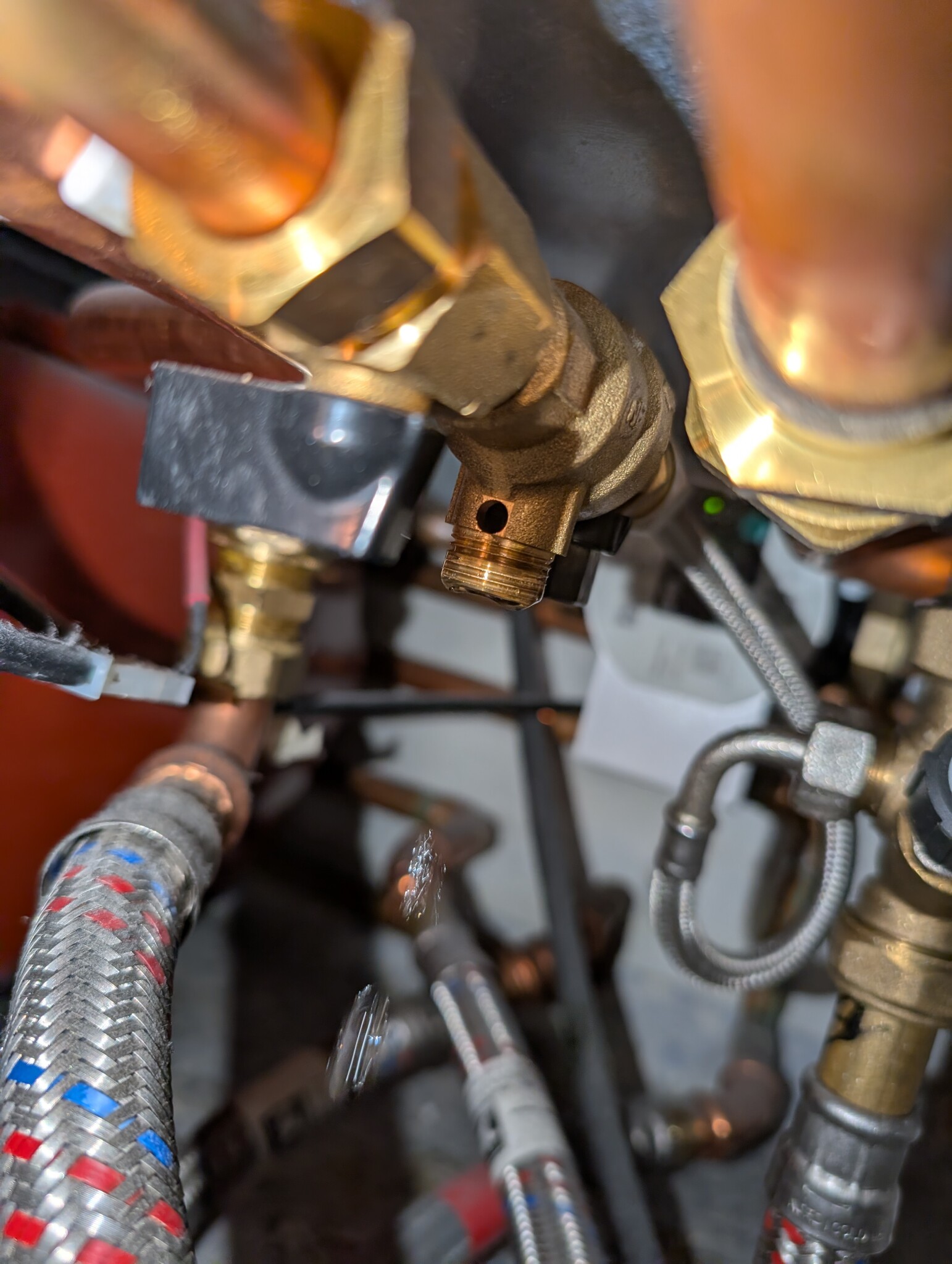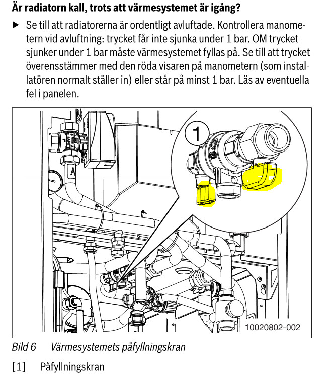 Vi har en ivt 302 frånluftsvärmepump från 2021. Igår kom felkoden 6209 -kontakta installatör (ngt enligt hemsidan om kompressorn startar inte) pumpen fungerar men när vi kollade i serviceluckan så droppar det friskt från guldröret som går ned efter påfyllnadsventilen. Trycket var 0,3 på manometern, men vi har fyllt på till 1,5. Det finns en mindre svart ventil efter som står i vertikalt/öppet läge. När man vrider den i horisontellt läge slutar det droppa, men ska den dock vara i vertikalt läge? Vi har aldrig rört den tidigare.