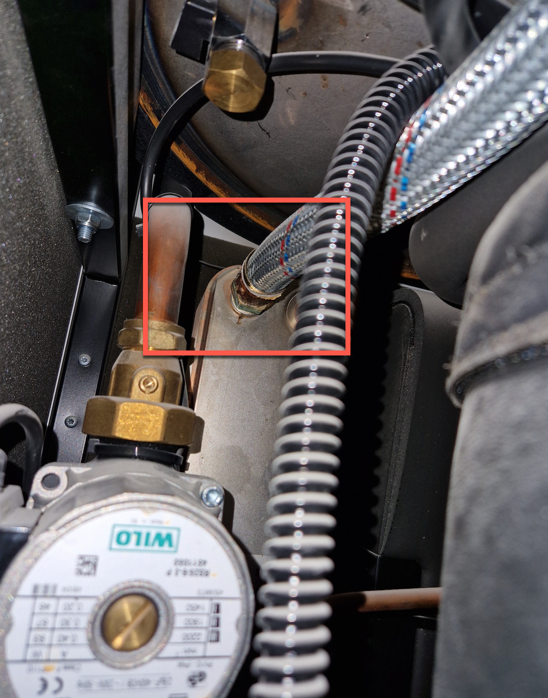 *stålomspunnen slang vid anslutning till värmeväxlar-låda (?)