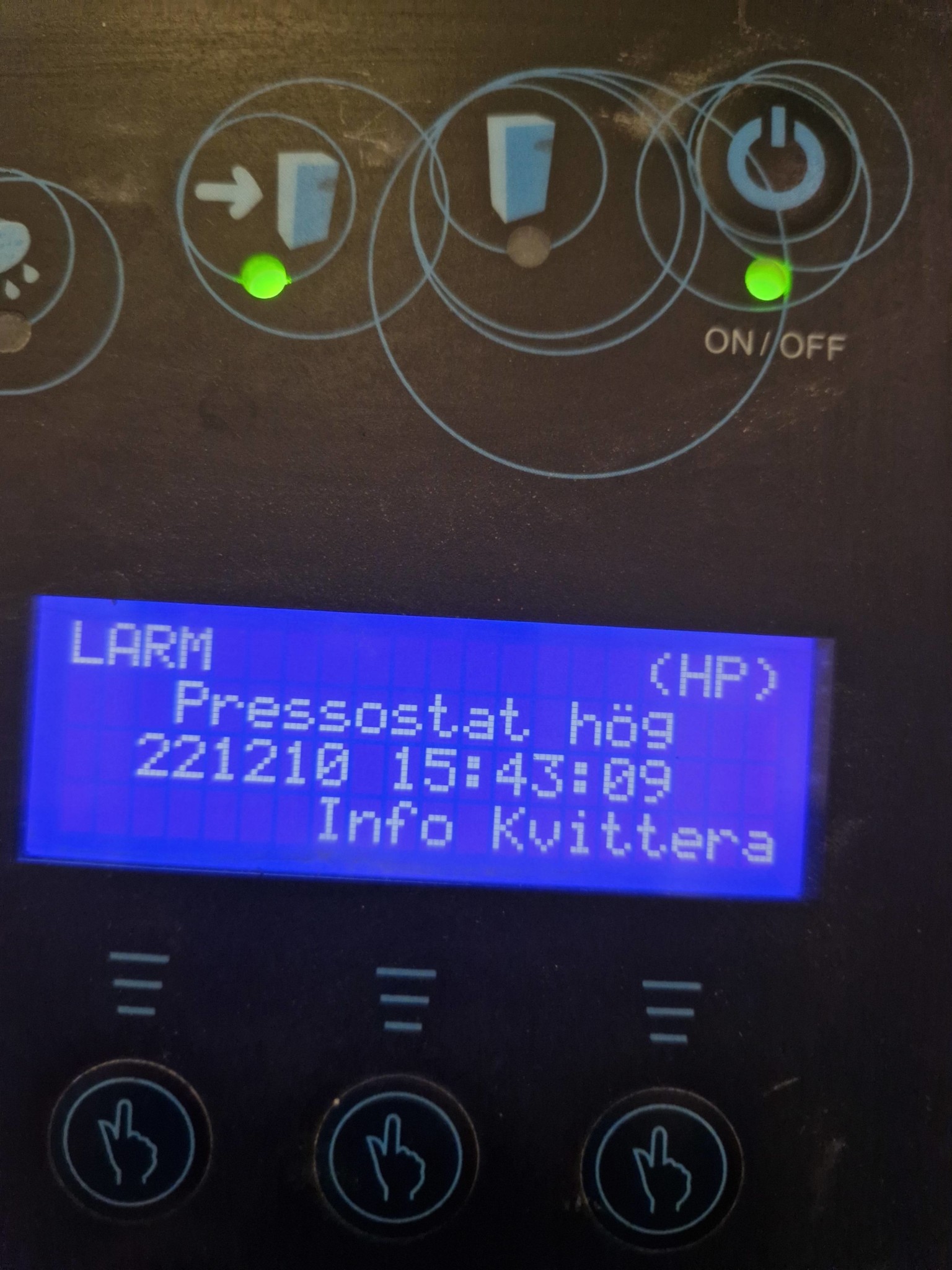 Nu när riktiga Sthlms-kylan (-7° typ konstant 2 veckor) kommit i kombination med elpriser över det normala så har pumpjäkeln börjat larma "Pressostat hög". Det kommer för att sedan försvinna efter 1min. Så pågår det några timmar för att någon gång per dygn stanna kvar på riktigt, så att jag måste kvittera det för att det ska försvinna. Till följd så går elpatronen igång några timmar och ruinerar mig. (vilket den gör eftersom den ska det vid larm)