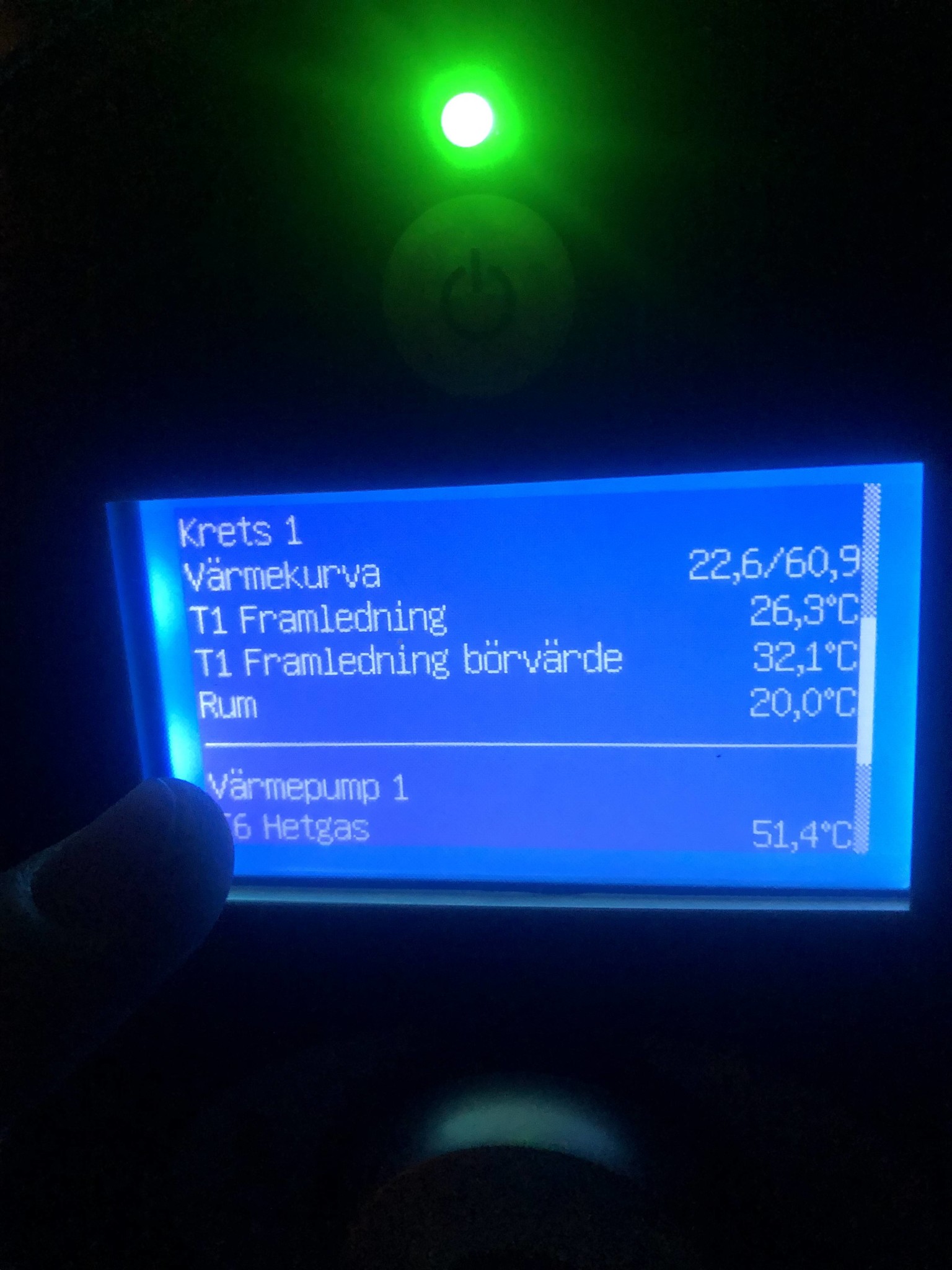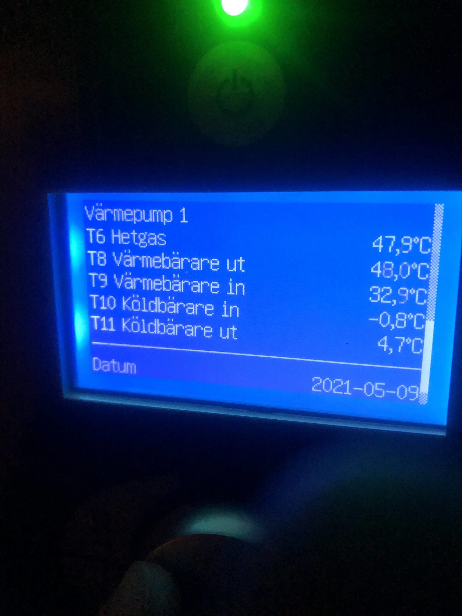 Om du vågar dig in i installatörsläge kan du handköra Köldbärarpump G3. Kolla att pumpen låter ok, att du hör att köldbäraren flödar och kolla att T10 och T11 ganska omgående lägger sig på samma värde = köldbärarens temperatur.