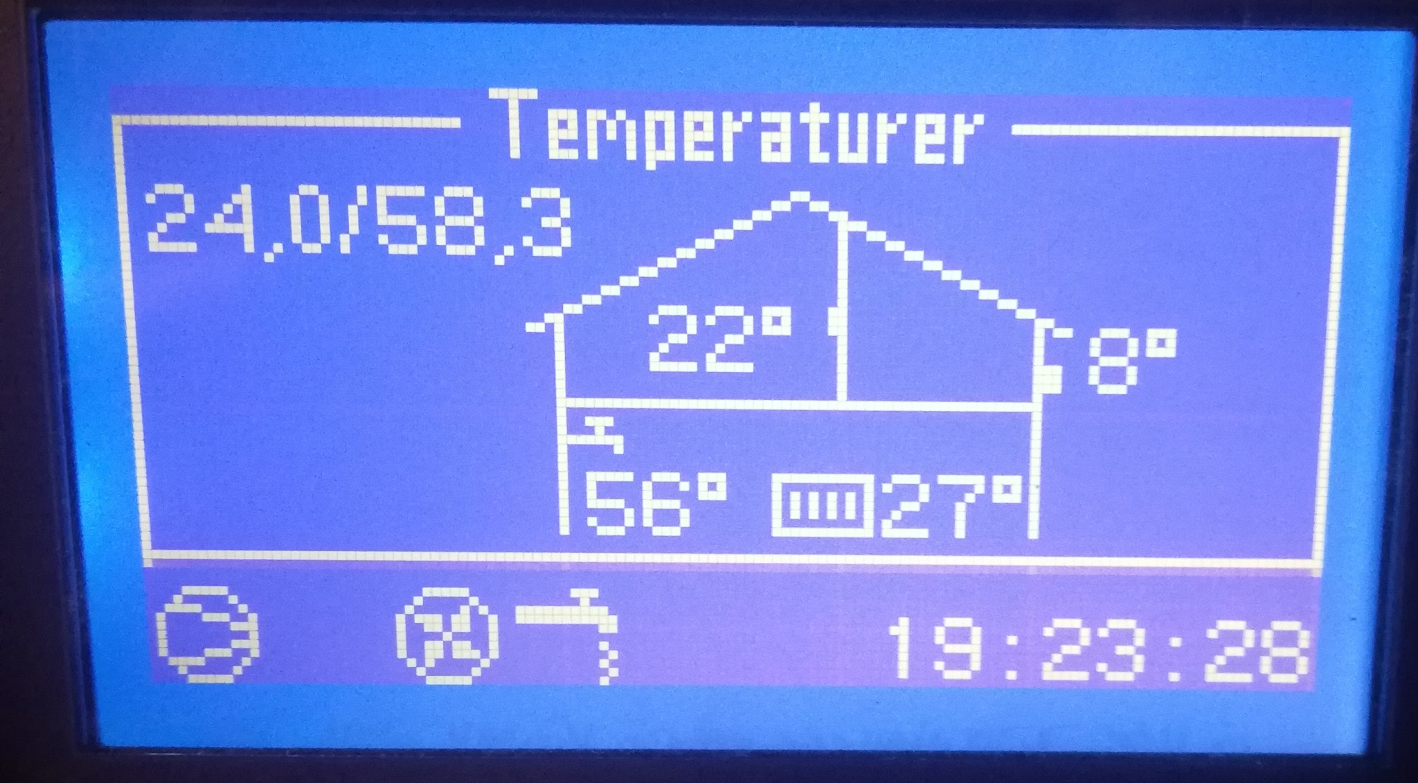 lite värme. Ser temperaturerna nedan rimliga ut? (Är det 27 grader i elementen vid 8 grader ute?) Röret med utgående vatten känns kallare än i sommras, innan kurvändringen.