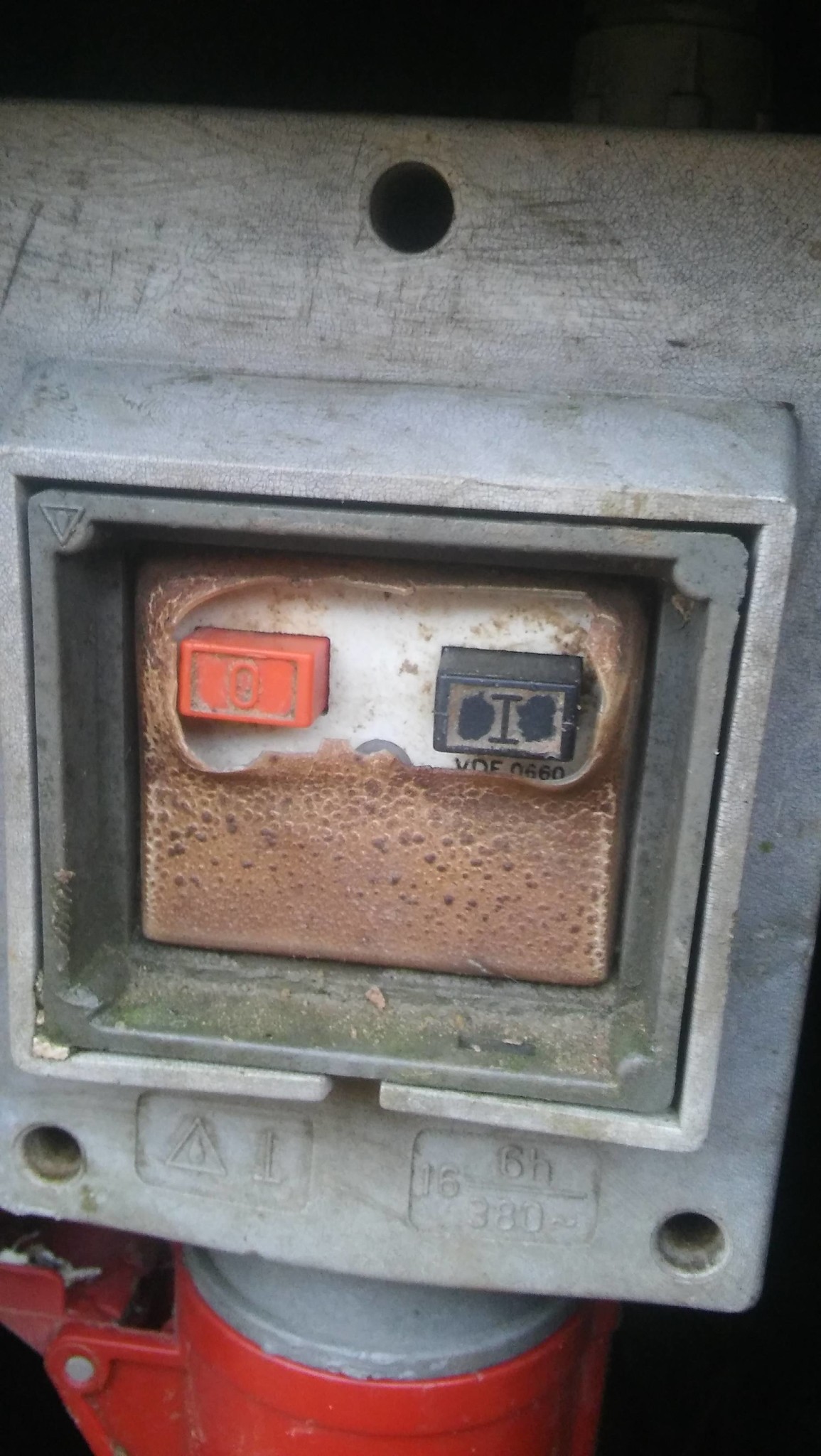 Jag hade elektrikern på besök idag och då passade jag på att fråga honom. Han drog ur kabeln, satte sedan i den igen och tryckte på ON och då gick maskinen igång igen. Jag var inte förvånad för så har hänt tidigare också. Han föreslog att jag skulle byta ut hela paketet men han var däremot osäker på om det gick att få tag i en liknande kapsling. Jag ringde tillverkaren av maskinen och har mejlat bilder till dem, får se hur det går..