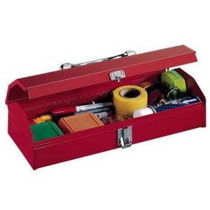 En klassisk amerikansk toolbox; Fyrkantig med rundat lock i rödlackad plåt och med snäpplås och handtag i krom. Någon som vet vart man hittar en gedigen sådan?