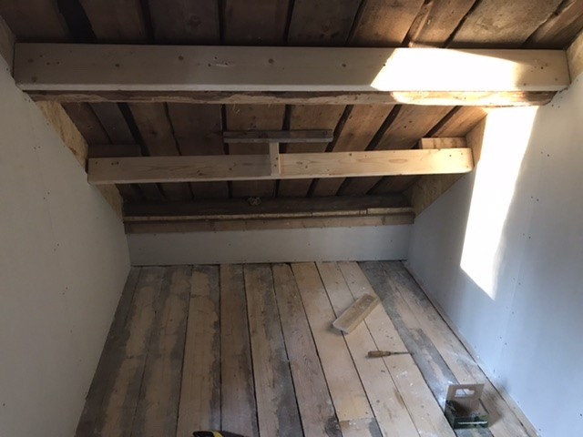 Ena bilden visar läget innan taket isolering och pärlspont. Andra bilden visar rummets låga takhöjd och tillpassad masonit som endast ligger lös.