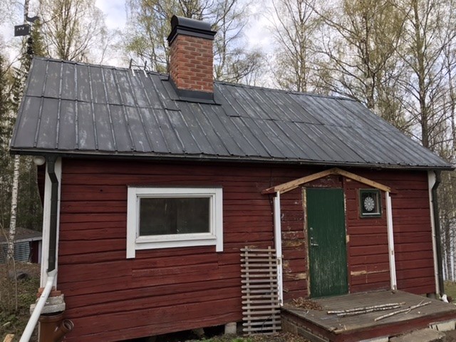 Vi har ett timrat torp med två små sovrum med brant sadeltak på övervåningen.