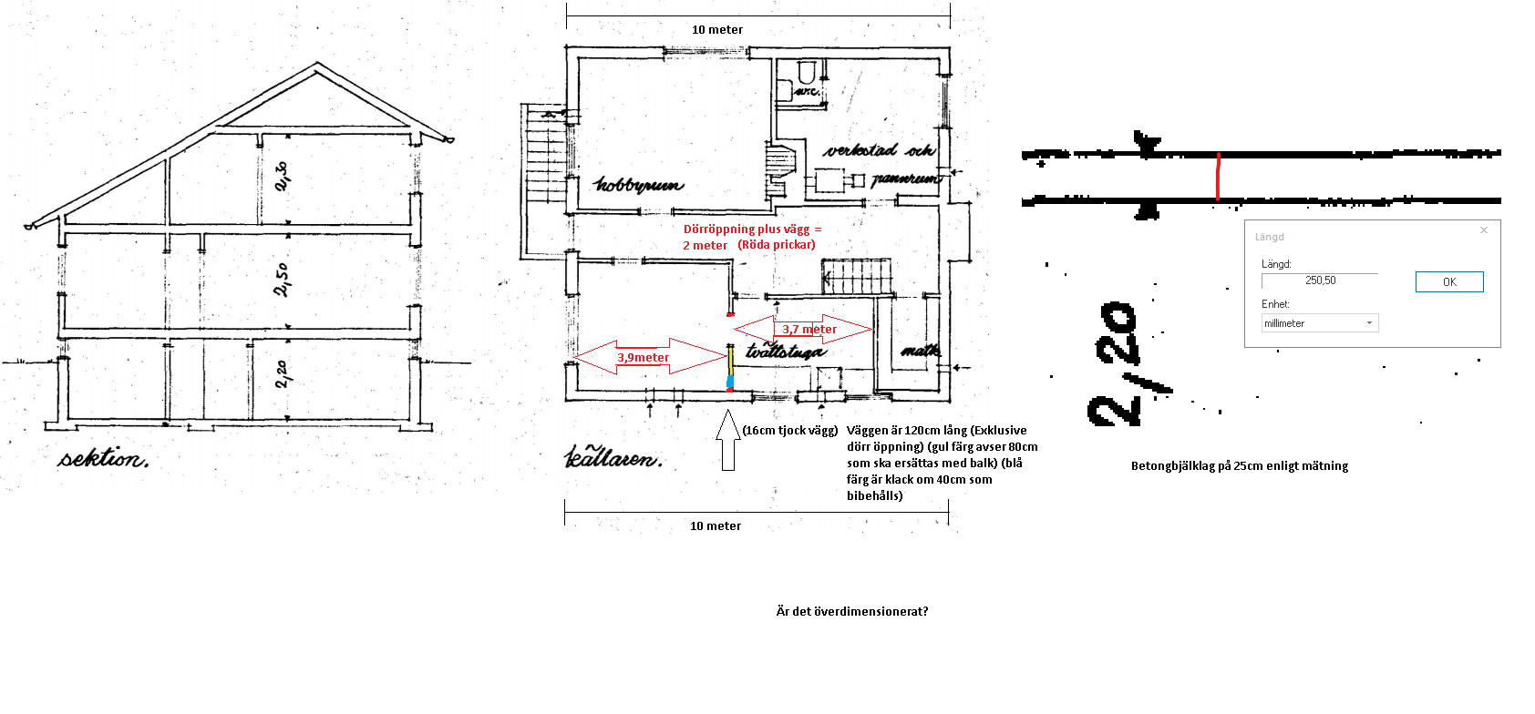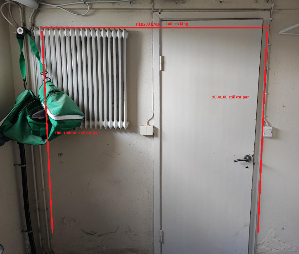 På planritningen har jag skrivit in mått med färg anvisningar. Väggen är 1,2 meter plus dörröppningen 80cm. 2meter totalt. Men balken ska enbart avse 160cm. Alltså dörröppning plus 80cm av "gul" vägg. Totalt ska alltså en HEB200 balk om 160cm ersätta befintlig dörröppning plus 80cm vägg.