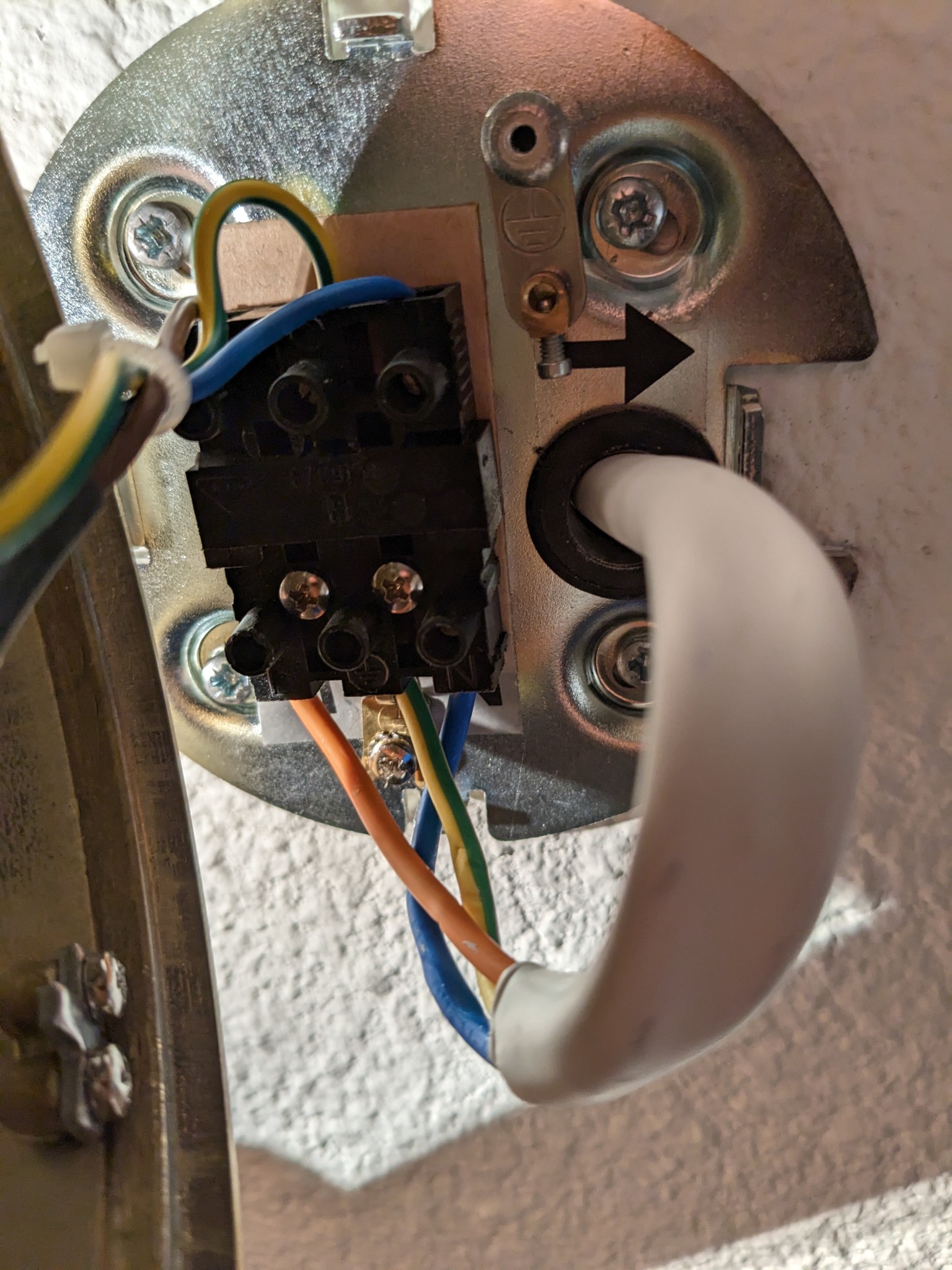 3. På andra sidan i armaturen, i koppen har vi 3 kablar. Blå, brun till lampan och en gröngul som är skruvad i höljet (koppen) ej samma som ovan