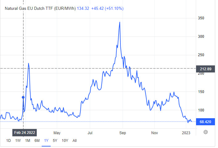 Priset på gas är idag €65/MWh, för exakt ett år sedan var de €75/MWh. Dvs priset på gas är LÄGRE idag än före kriget.
