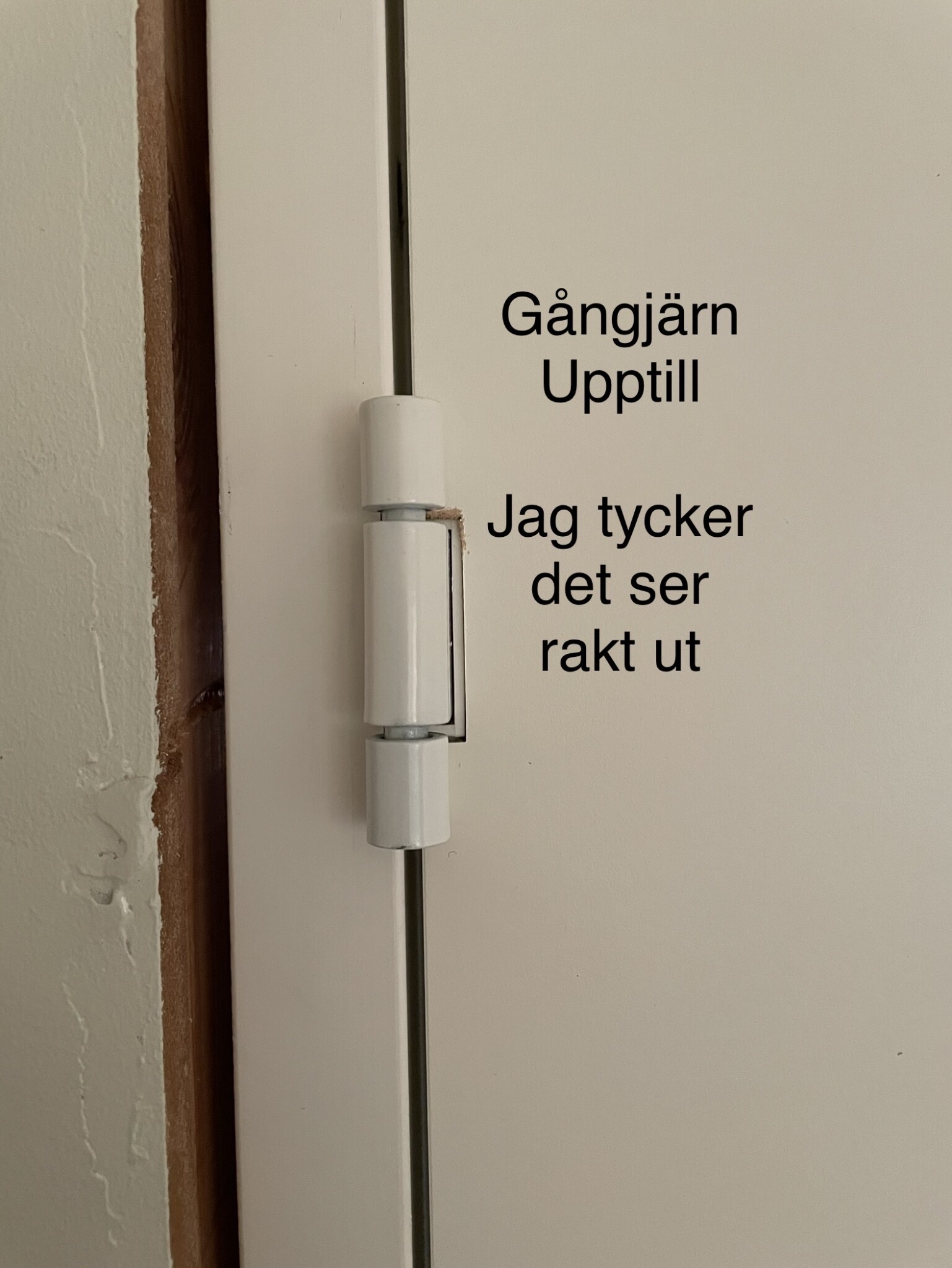 Man skall även väga av överstycket så att det är i våg. Det är inte gjort därav din glipa i överkant. Gångjärnssidan är inte helt i lod heller. Det ser heller inte ut som en massivdörr med tanke på gångjärnen.R Robbobert skrev:Förstagångare som satt karm och hängt dit en innerdörr. Karm monterad med långpass och jag bedömer att den är good enough. Hängde dit en dörr (modell massiv vilket gör att den är rätt så tung). Stängde dörren och nu till gliporna…som jag förstår det justeras dessa (gliporna mellan sidostyckena och dörr) med karmskruven, eller ja hylsan på skruven då. Har dragit in karmskruven så hylsan hamnar 8-10mm in i karmen vilket gör att jag får det att spela med.