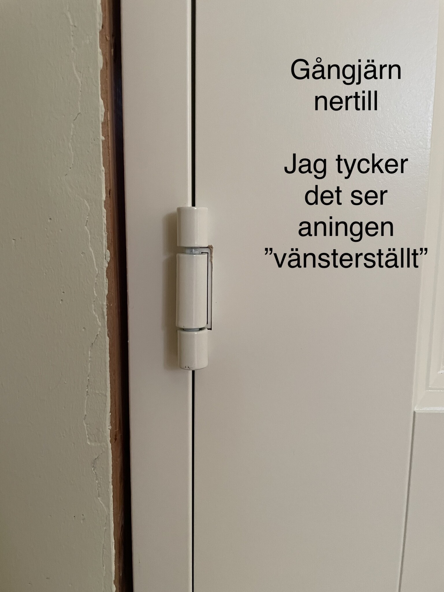 MEN den glipa jag inte förstår mig på är den i ovankant? Dörrblad mot överstycke alltså. Om jag stänger dörren och tittar på den så ser det ut som dörrens högra sida ”hänger ner”. Det känns som att denna glipa inte justeras med hjälp av karmskruven eftersom dörren hänger ju i karmen? Jag skulle vilja ge på dörren en smäll nere i vänstra hörnet (tittar på dörren som bilden är tagen).