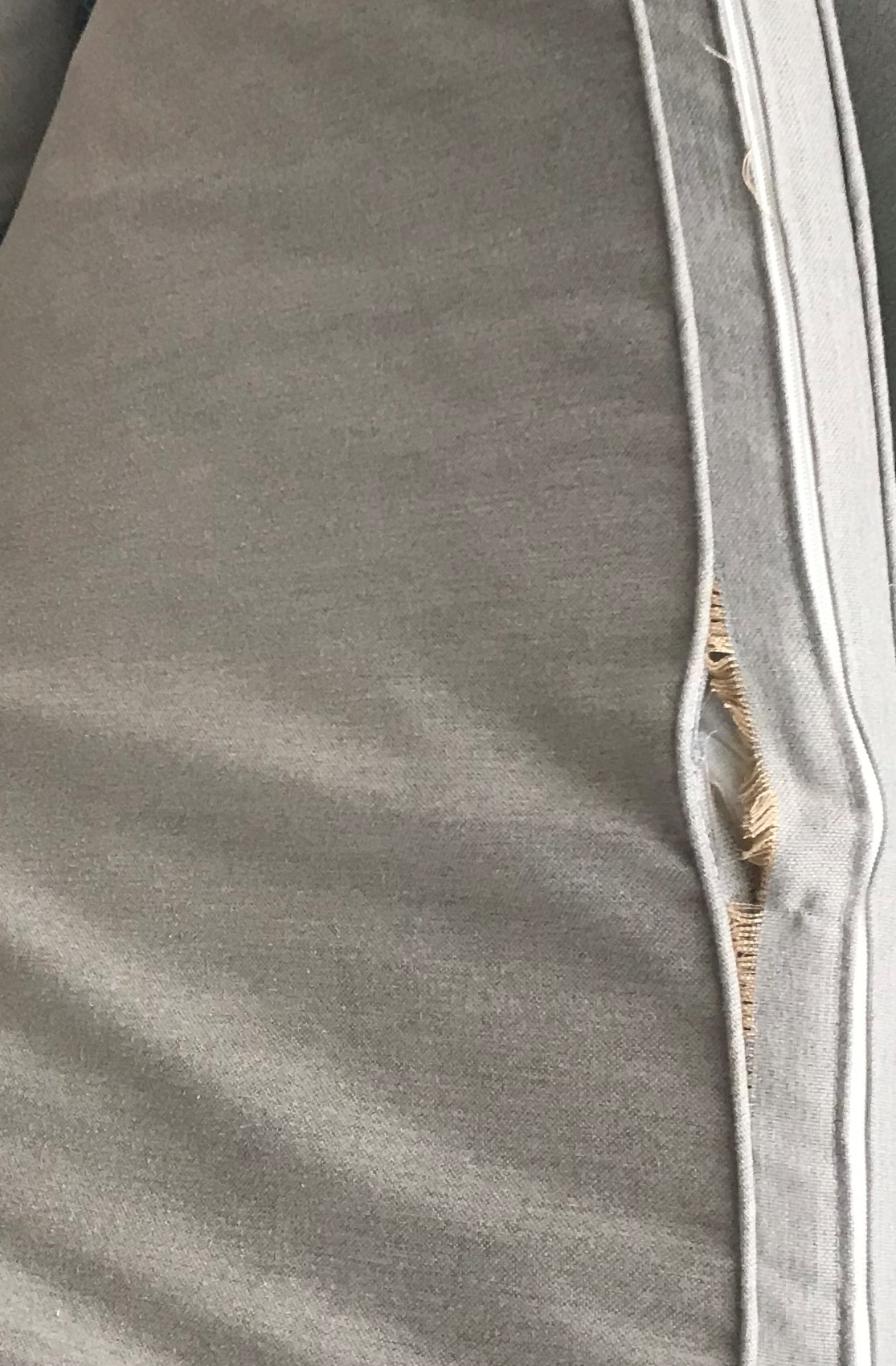 Ser ut som ett ursprungligt tillverkningsfel med för lite tyg vid sömmen/fållen eller annat felaktigt utförande som gjort att tråden dragits genom tyget. Hade tagit det vidare till ARN om de vägrar i enligt med 3-åriga reklamationsrätten. Dynan ser ju fin ut i övrigt så misshandel blir nog svårt att hävda.