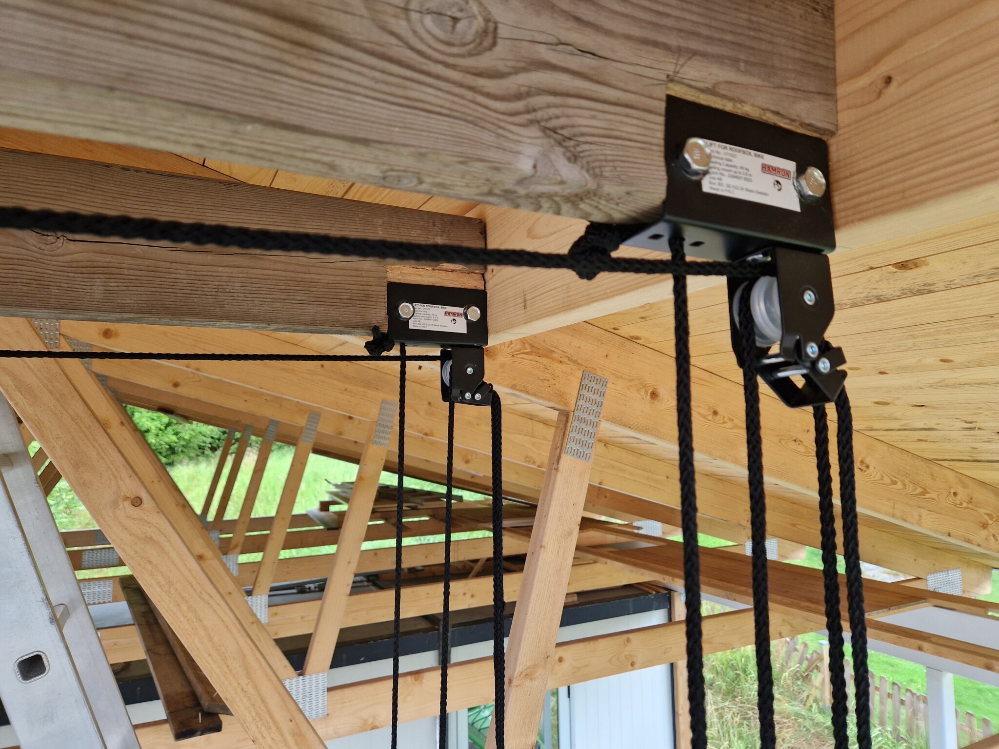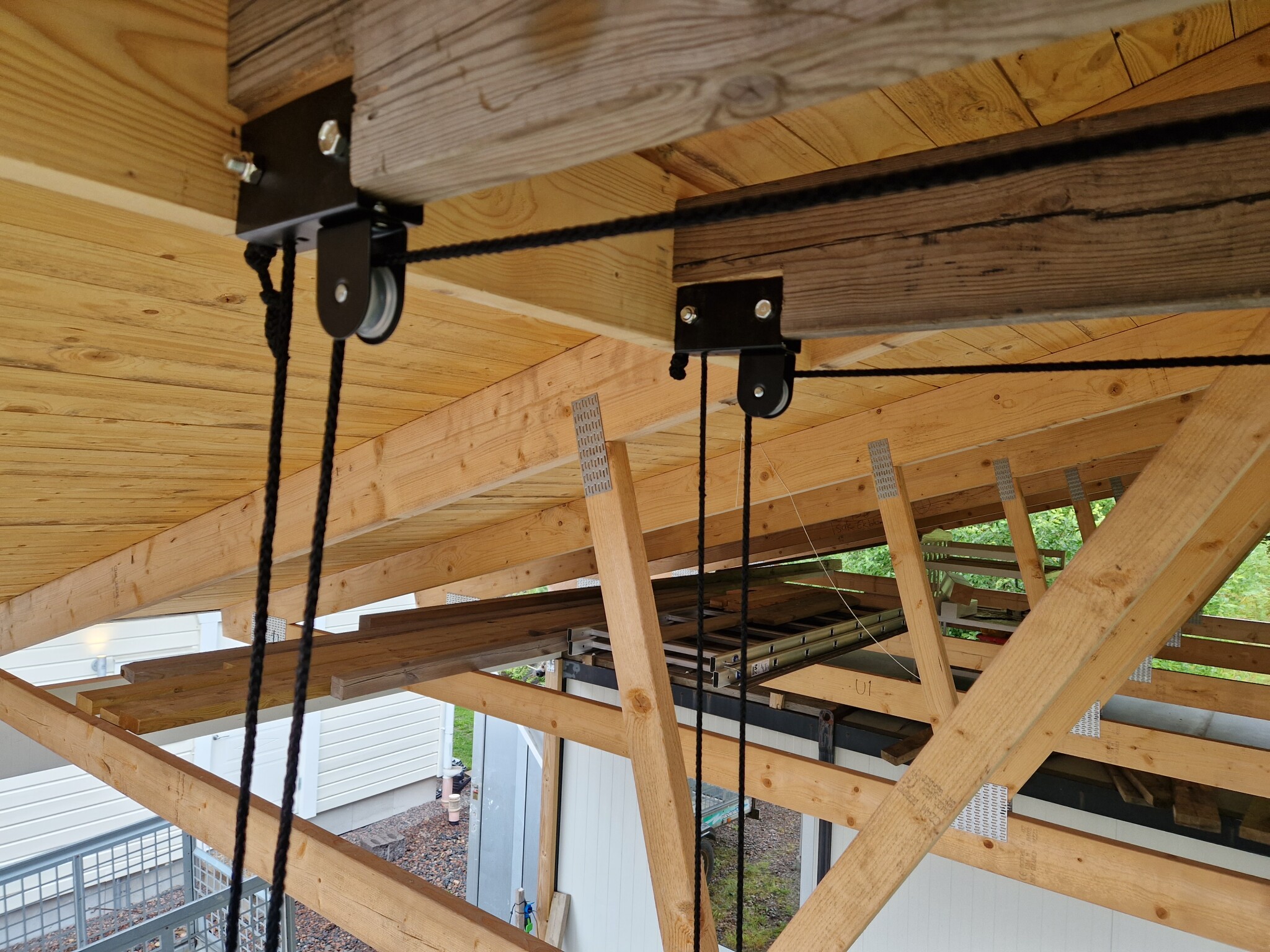 Därefter drog jag fast det mellan takstolarna och voila en ganska smidig dold upphängning för kajakerna.