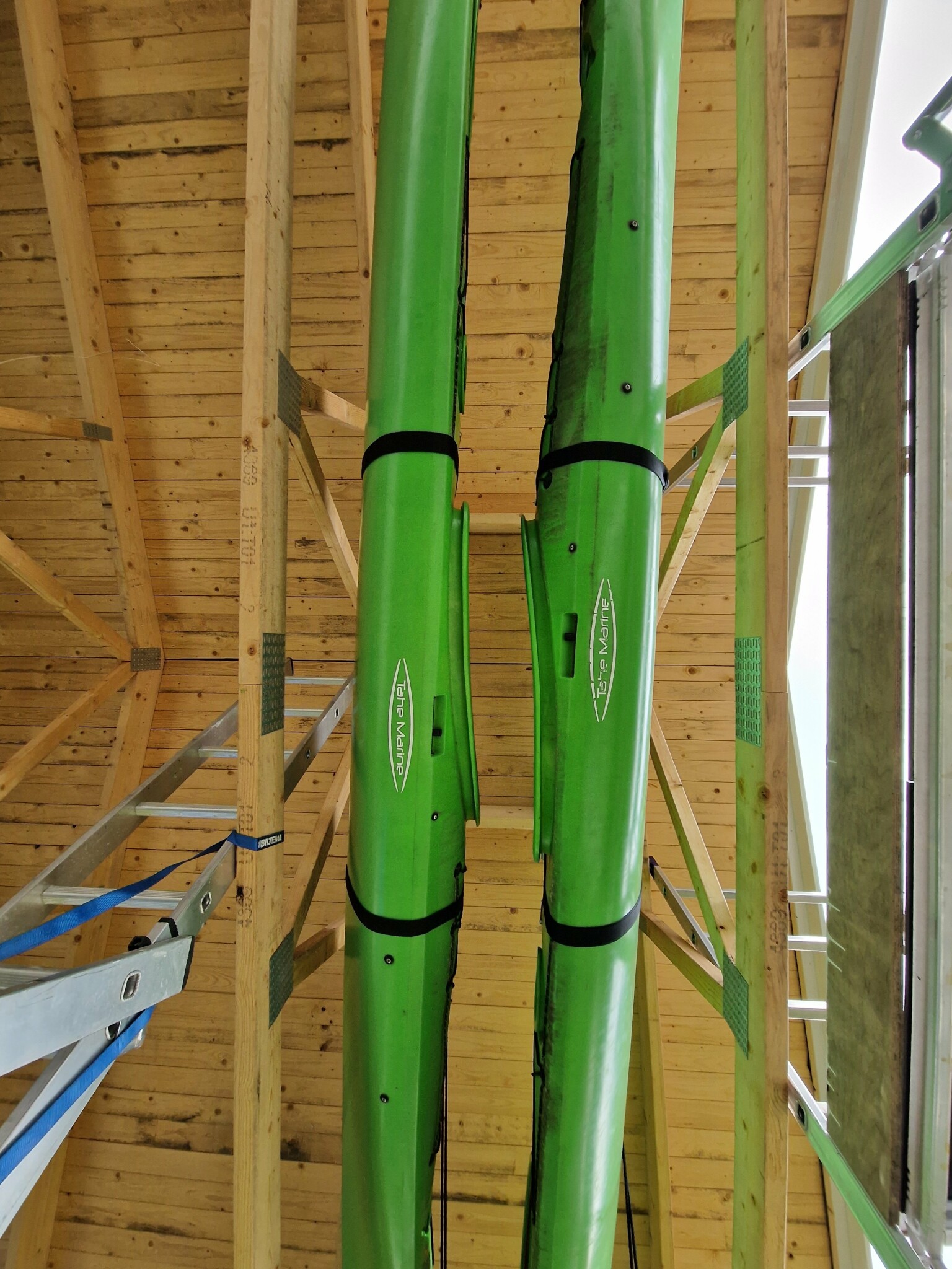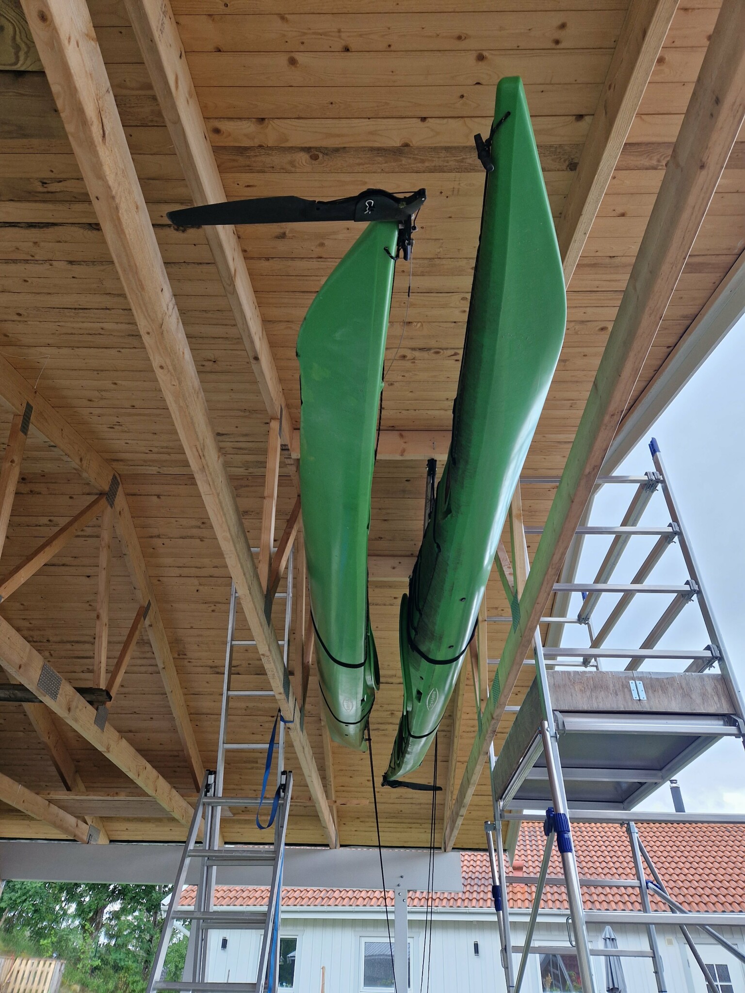 På grund av det höga taket så går det bra att snurra kajaken 90 grader i luften så att de kan hissas ner direkt på takräckena.