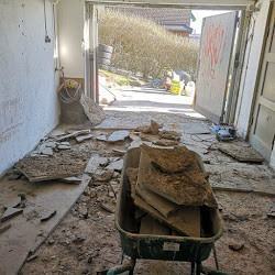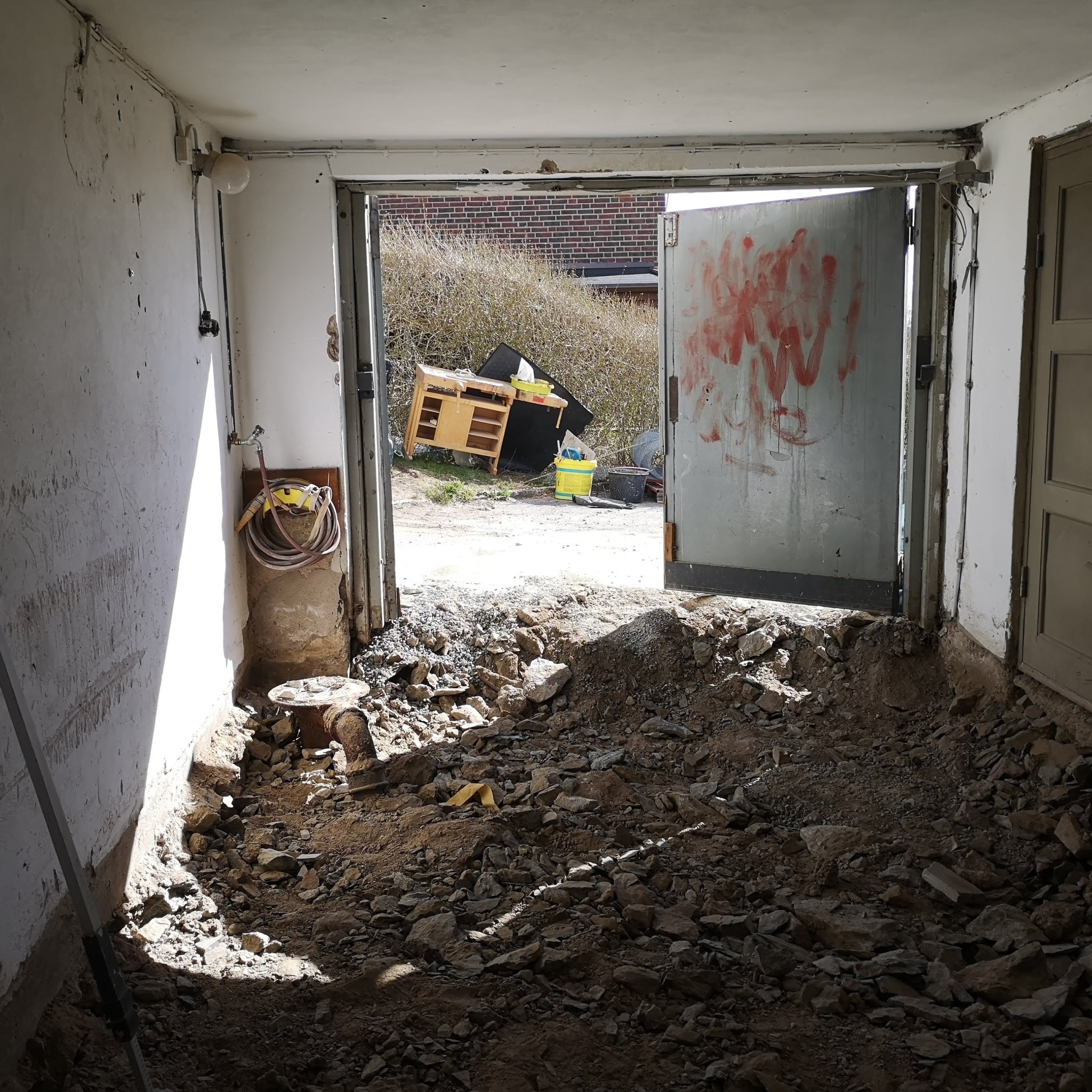 Förutsättningarna är ett funkishus från 30 talet högst upp på ett berg. Huset står till 75% på gamla schaktmassor som är väldränerade. Jag har grävt ut det gamla garaget. Planen är nytt golv med golvvärme.