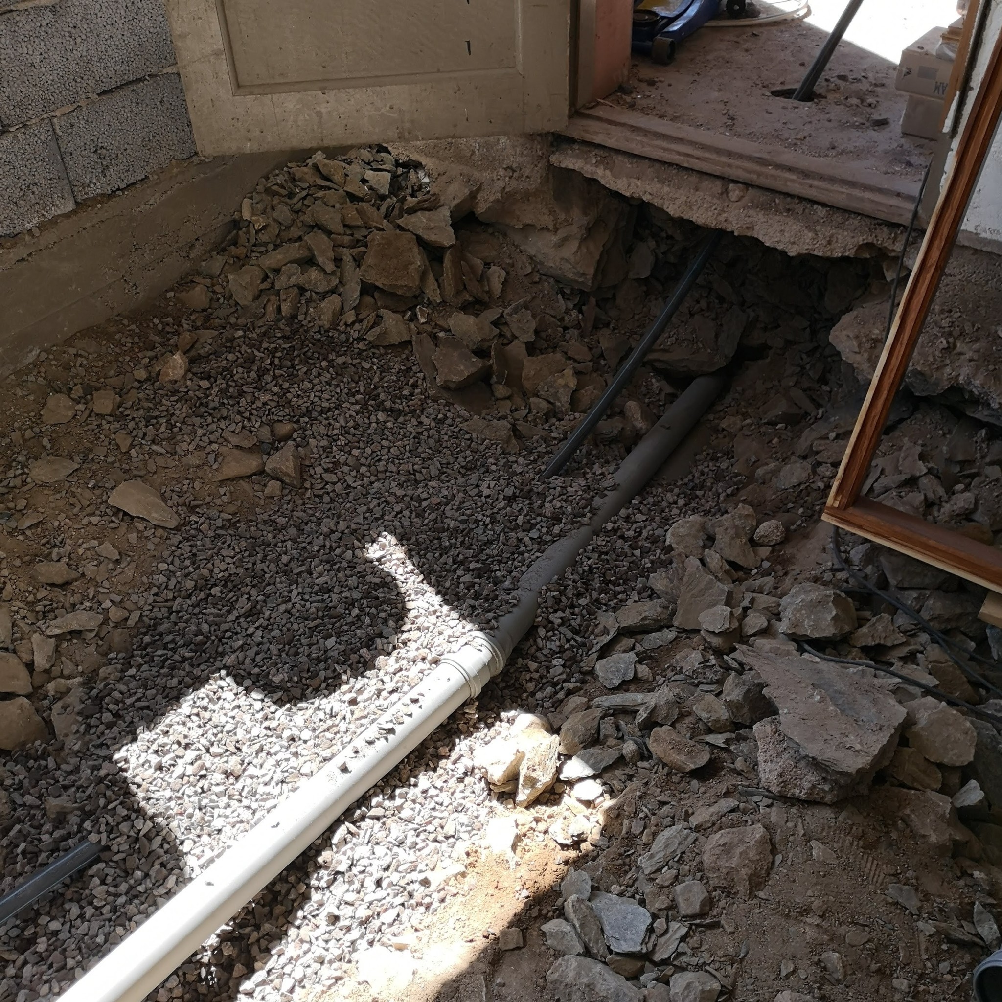 Fuktbelastningen är inte speciellt stor bortsett från vid den nya ytterväggen som vi murat upp i öppningen efter garageporten. Vid ytterväggen blir det makadam som finns i botten av schaktet fuktig men det blir inga pölar. I resten av rummet har botten av schaktdjupet varit snustorr under såväl sommar som höst.