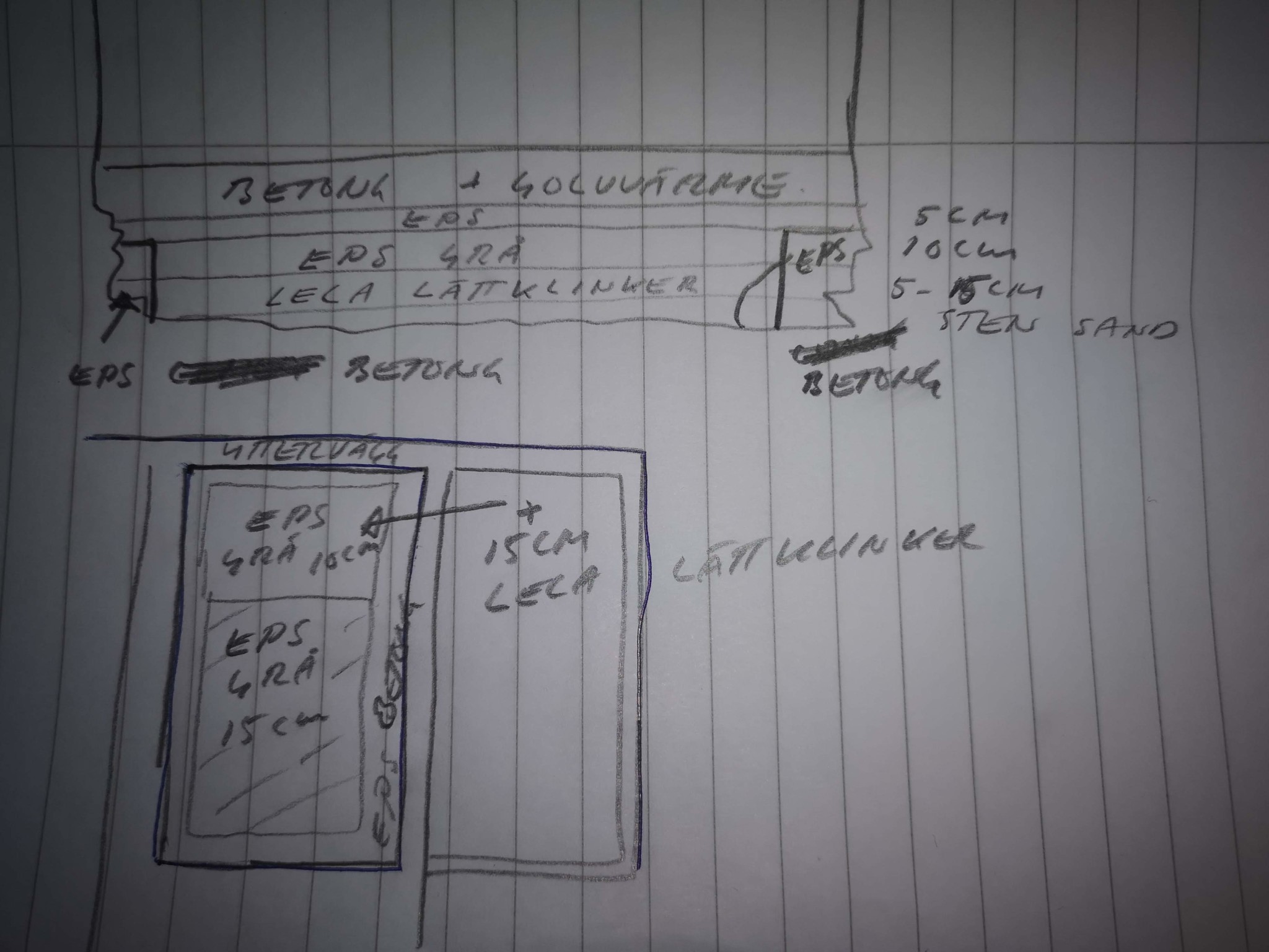 Plattan som skall gjutas är ca 17m2. I botten har jag ett tunt lager med makadam som jag sedan utökat med ett 5-15cm tjockt lager med lättklinker (lecakulor). Ovanpå detta blir det 15 cm EPS grå i större delen av rummet bortsett från närmast ytterväggen och längs med innerväggarna. Närmaste metern från ytterväggen är lite mer fuktbelastad. Där har jag lagt makadam, 15cm leca och sedan 10cm cellplast.