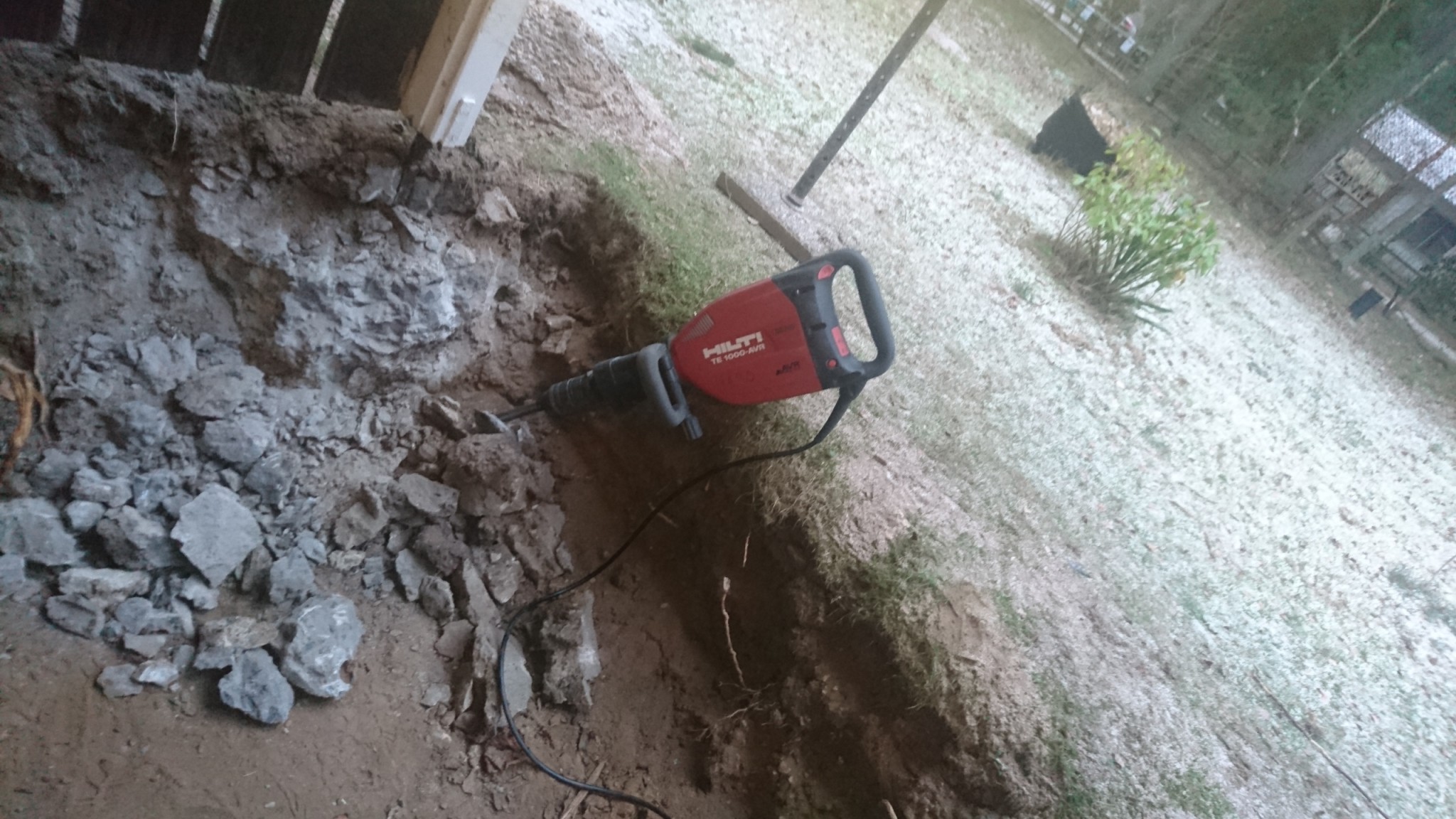I hallen-rännan tog jag hjälp och bilade lite hål med borrhammare samt underminerade betongen "underifrån" men tyckte även där att det var effektivast att bara slå på med lillsläggan.