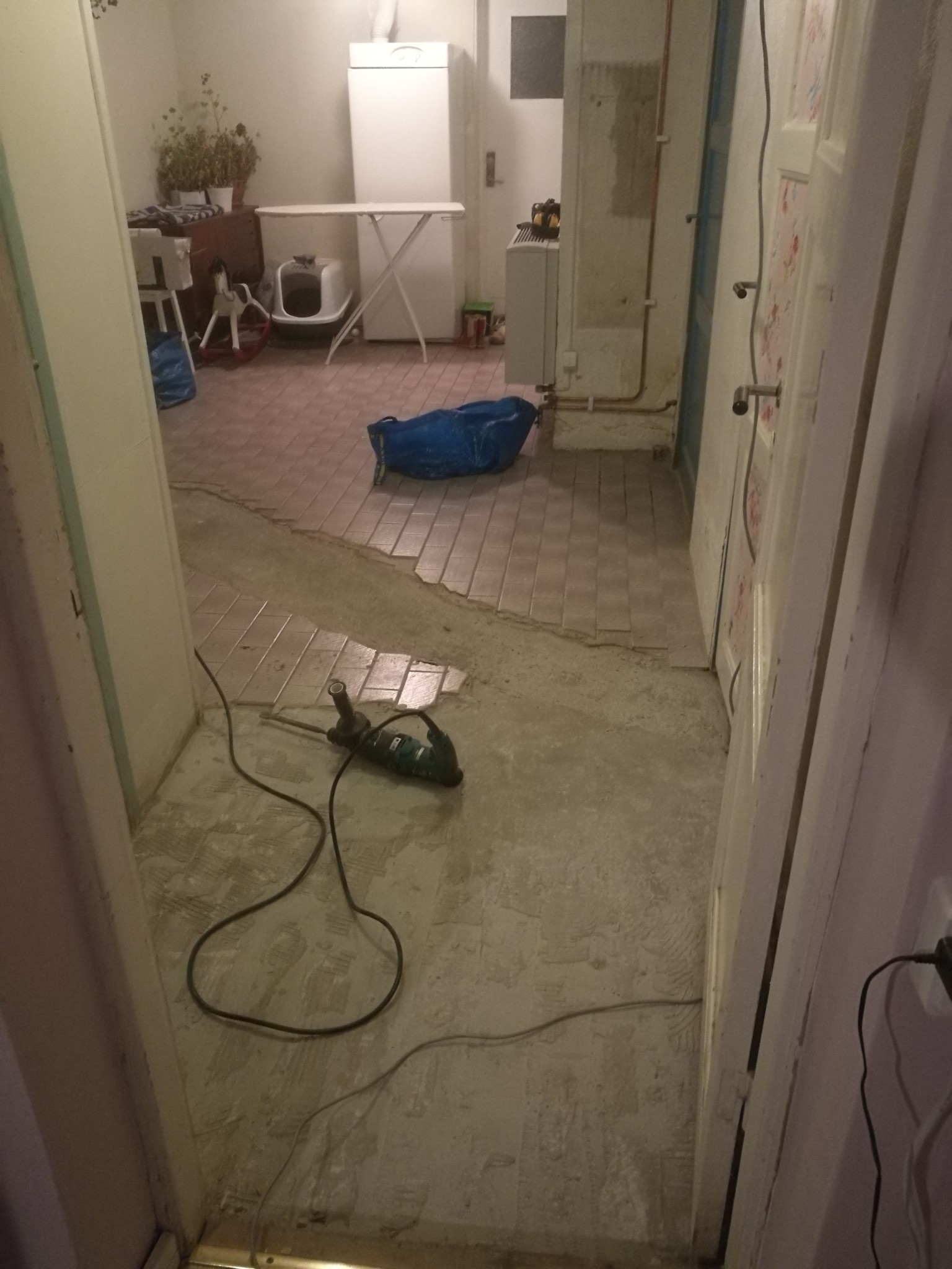 Så arbetet här har varit: slå bort klinkers och fix (började med slägga och stämjärn innan jag kom på att jag ju har en borrhammare nu för tiden