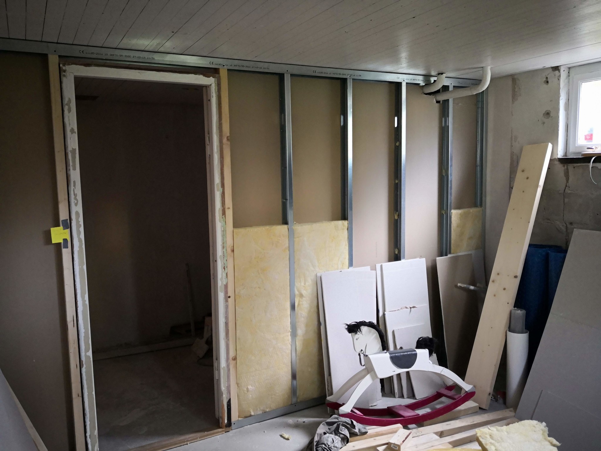 - Regla upp innervägg längs med högra källarväggen (är ej under mark, blir luftspalt, plåtreglar och isolering).