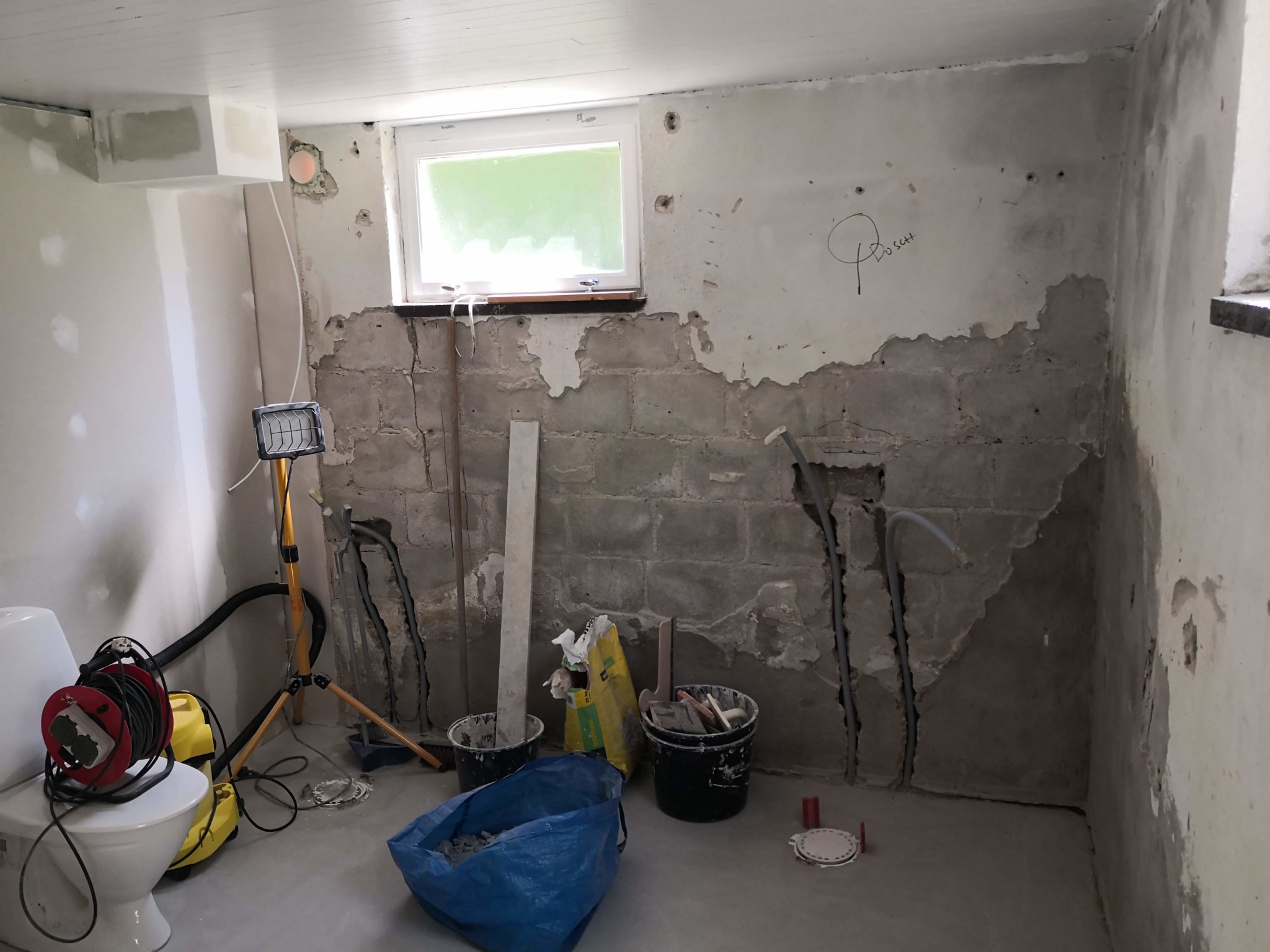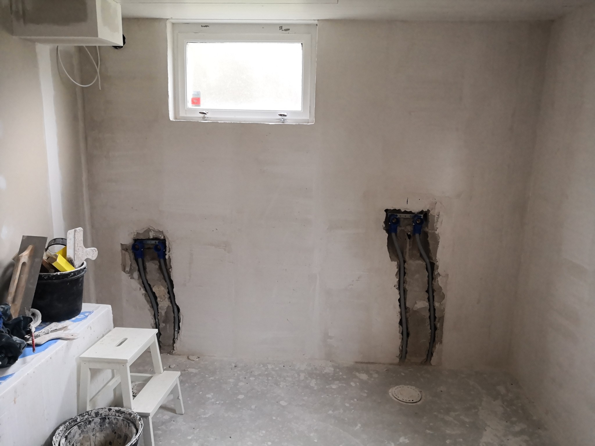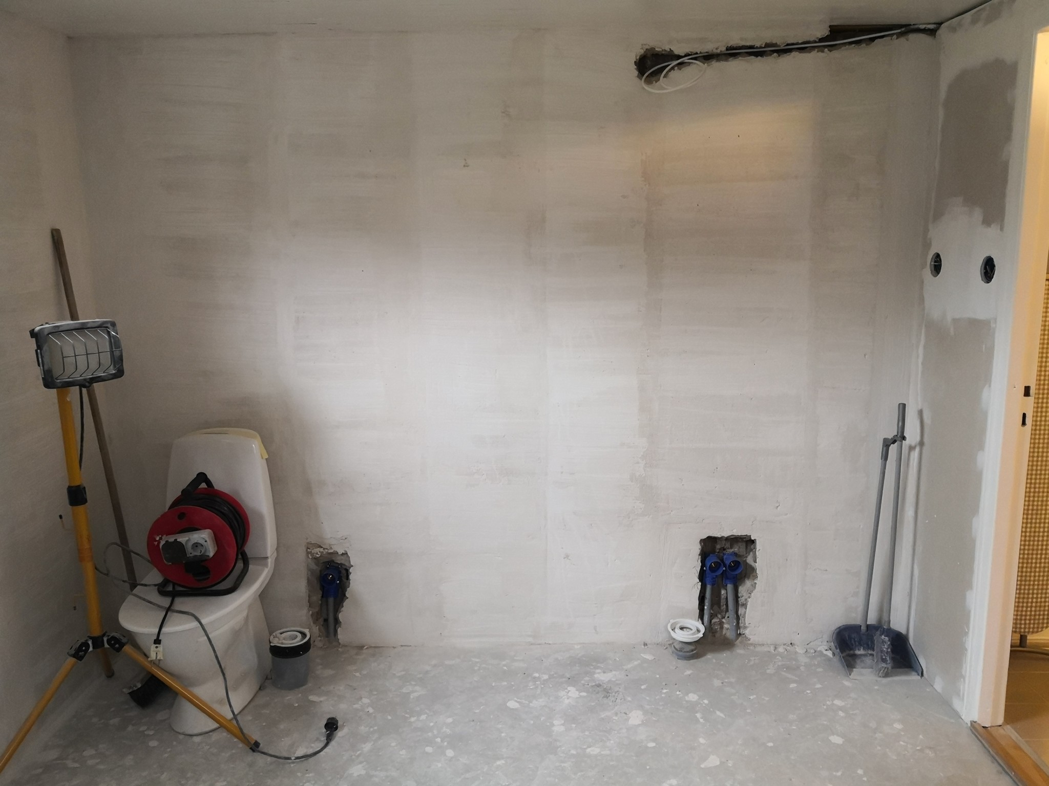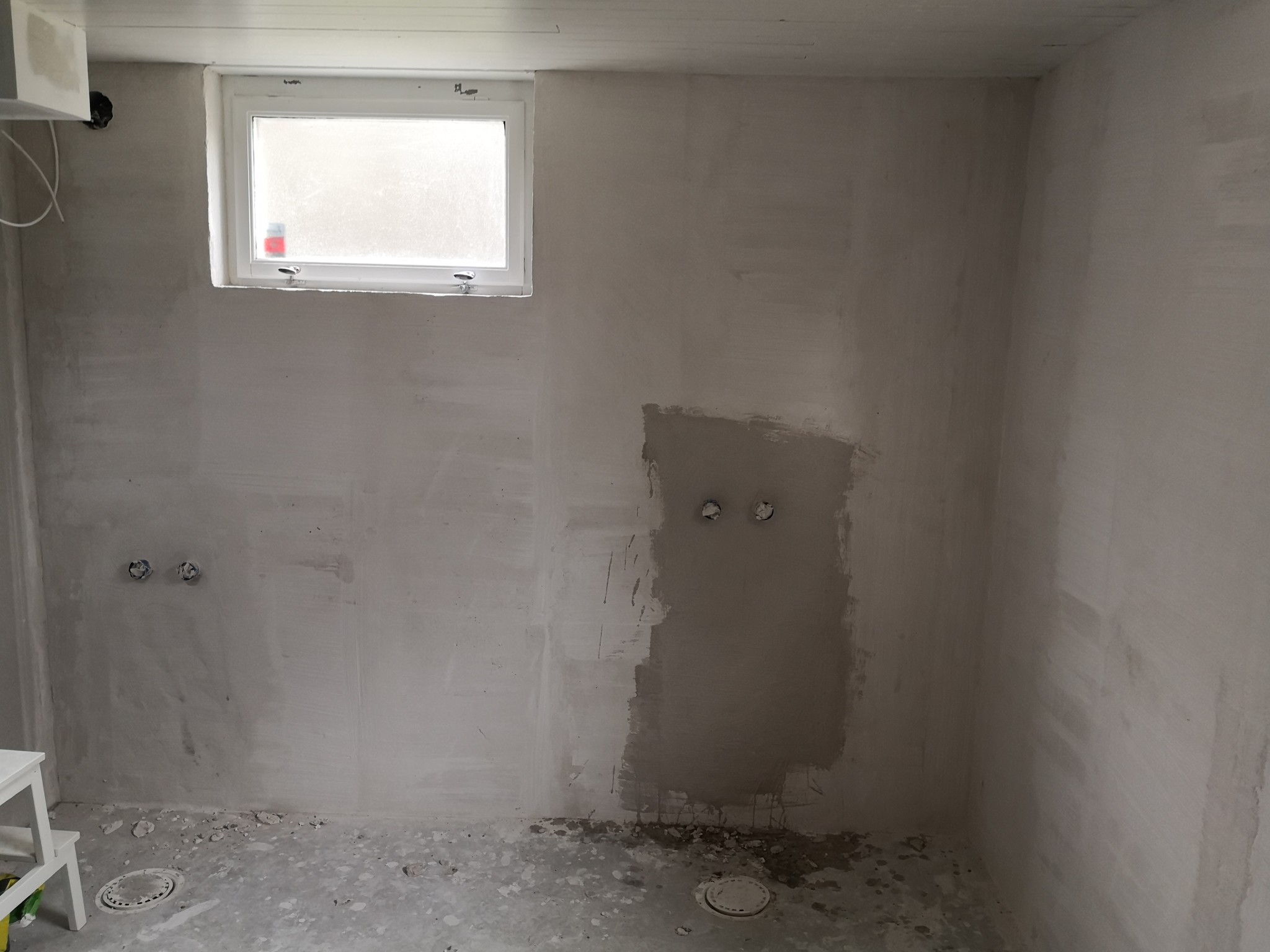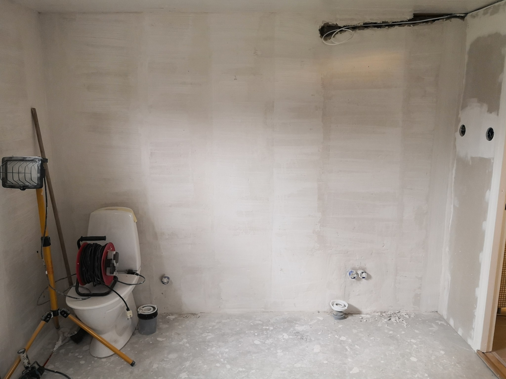 Putsning under våren, tätskikt sena sommaren, klinker och kakel höst, färdigt badrum tidig vår 2021. Vi får se