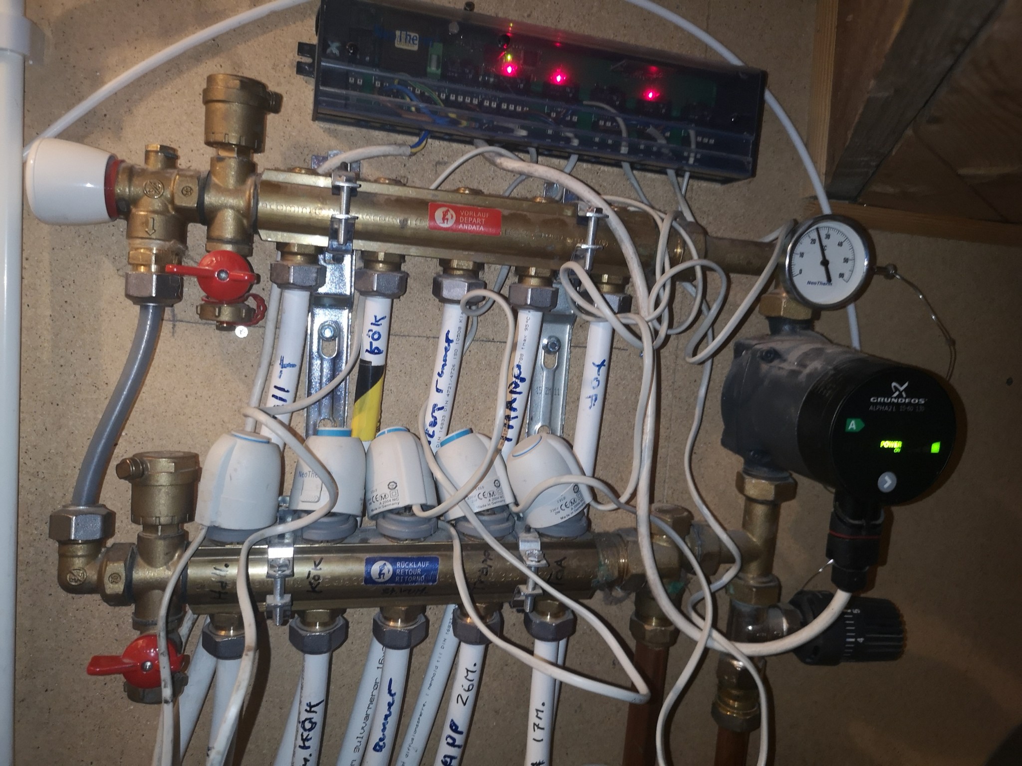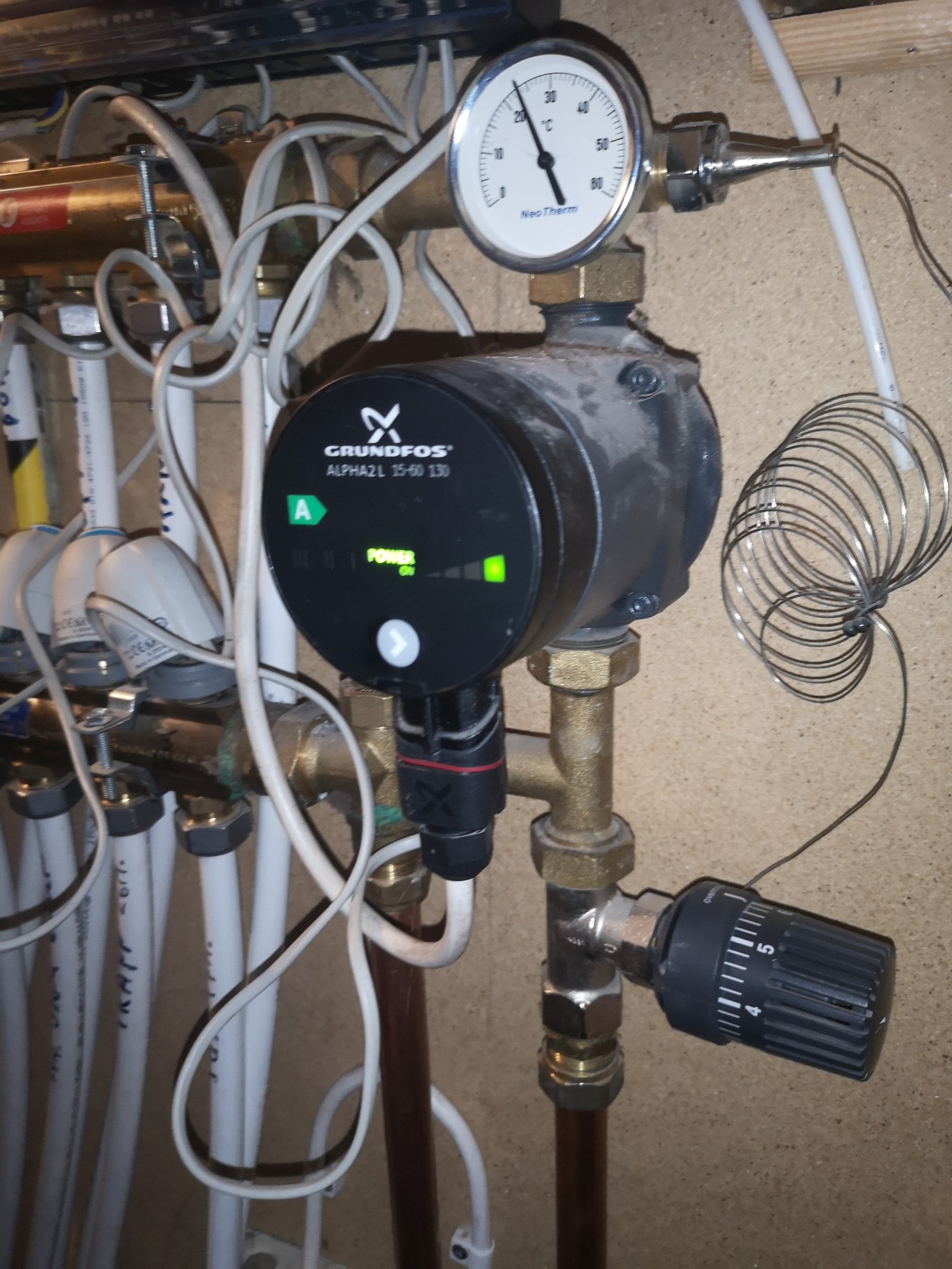 Har nyligen köpt hus med vattenburen golvvärme på nederplan. Får inte igång golvvärmen. Termostaterna står på max (de tre av fem med batterier i alla fall). Cirkulationspumpen brummar, men inga rör känns varma. Termometern ovan cirkulationspumpen står något under 25 grader, gick tillfälligt upp mot 30 en gång men föll sedan ned till under 25 igen. Någon som ser något direkt som ser tokigt ut eller vet något jag kan prova? Inga problem med värme upp till elementen på övervåningen.