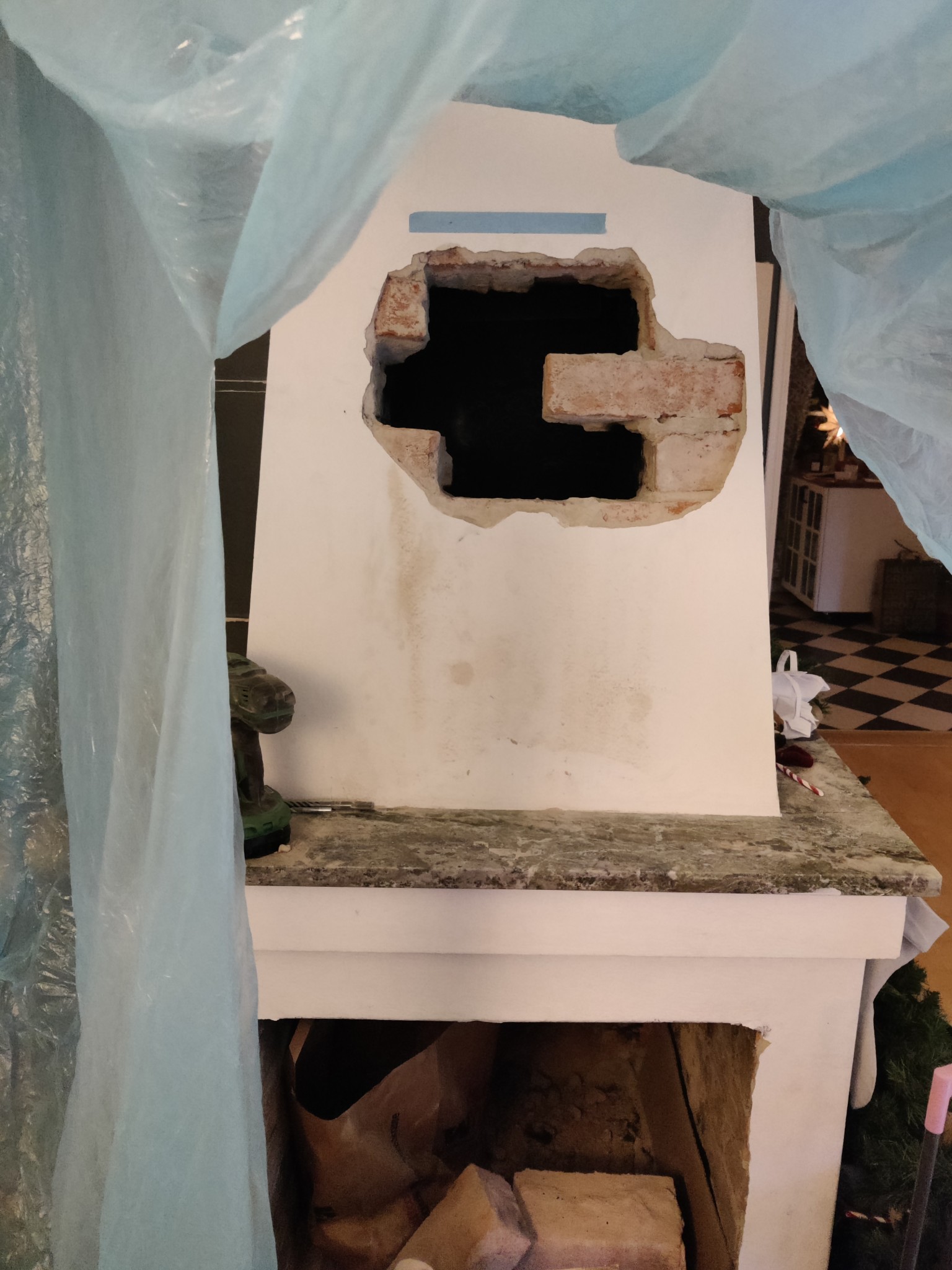 Mura igen kåpan är nog faktiskt tanken, men vi har inget slutgiltigt beslut där ännu. Mest för att vi inte kommer så högt upp i skorstenen utifrån håltagningen som är nu. Det kanske ger en liten tokig look med ett varmluftsgaller i ögonhöjd.