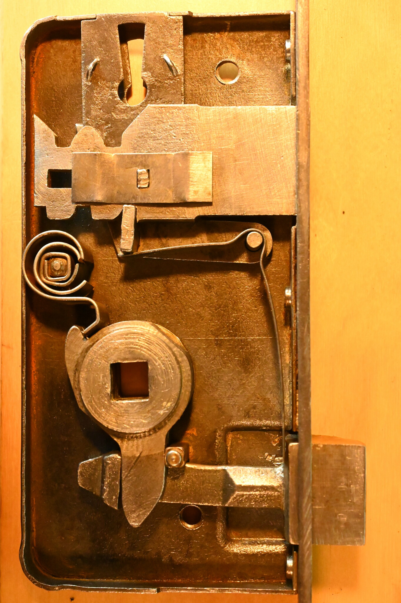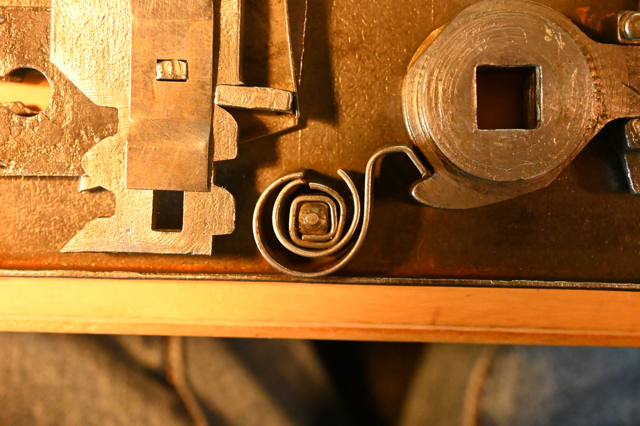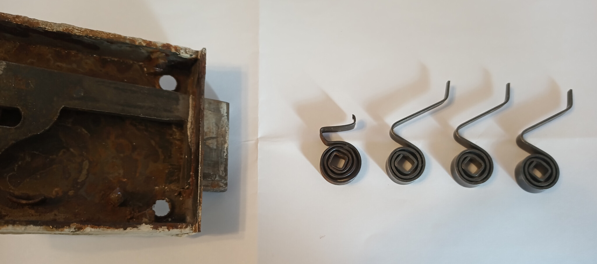 I ett av låsen jag försökte renovera visade det sig att en fjäder var av på två ställen, se detaljbild. När jag testar låset med trasig fjäder verkar det ändå fungera riktigt hyfsat, men noggrann som jag är skulle jag vilja få till en bra fjäder.
