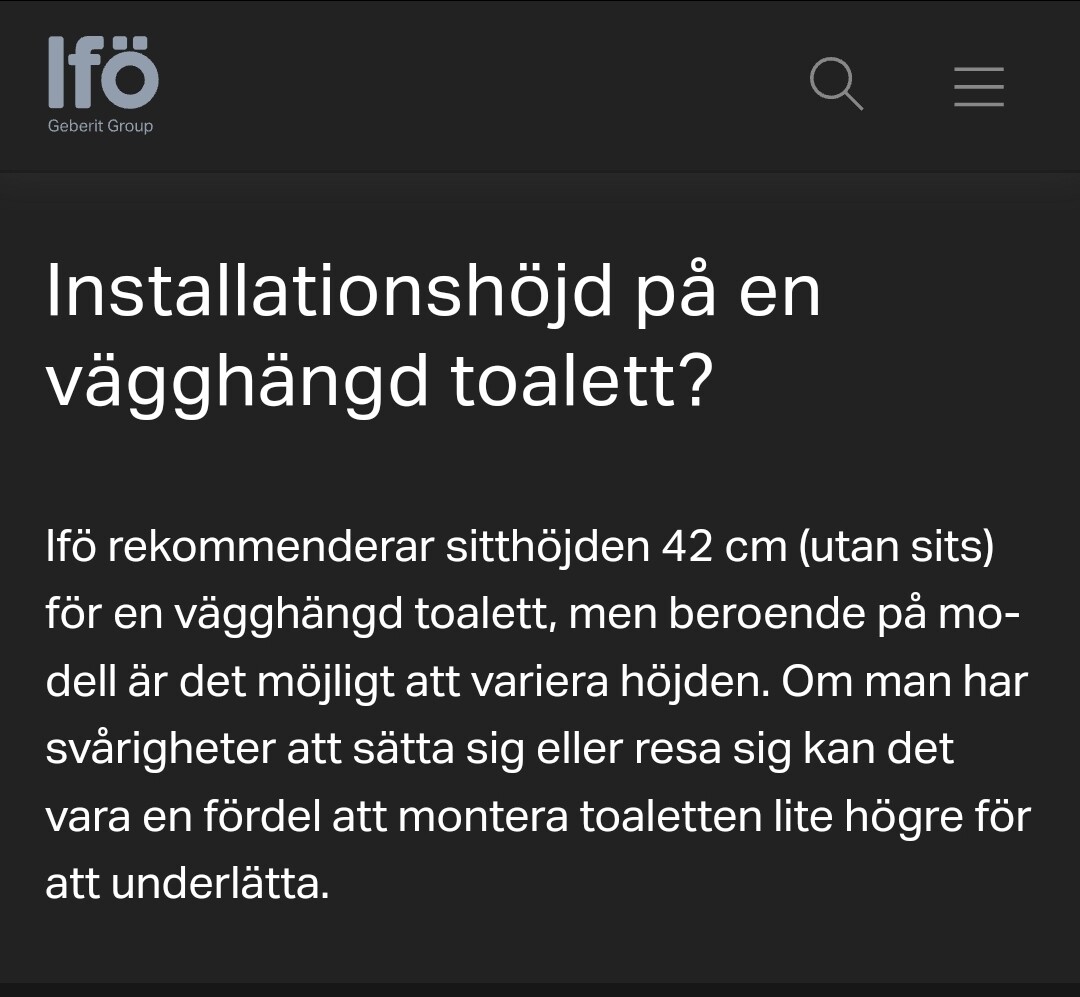 Tror nog att man faktiskt kan hävda den ska vara monterad enligt standardmått vilket t.ex bl.a detta borde styrka.W Wille58 skrev:Har funderat i dessa banor själv men tror inte denna fixtur har olika hålbilder på höjden, däremot på bredden. Huset ännu inte besiktigat men även om det vore så är detta nog inte att betrakta som fel, egentligen. Tror inte det finns angivet exakt sitthöjd på toaletten. Men de 3 cm som det gäller gör rätt mycket.