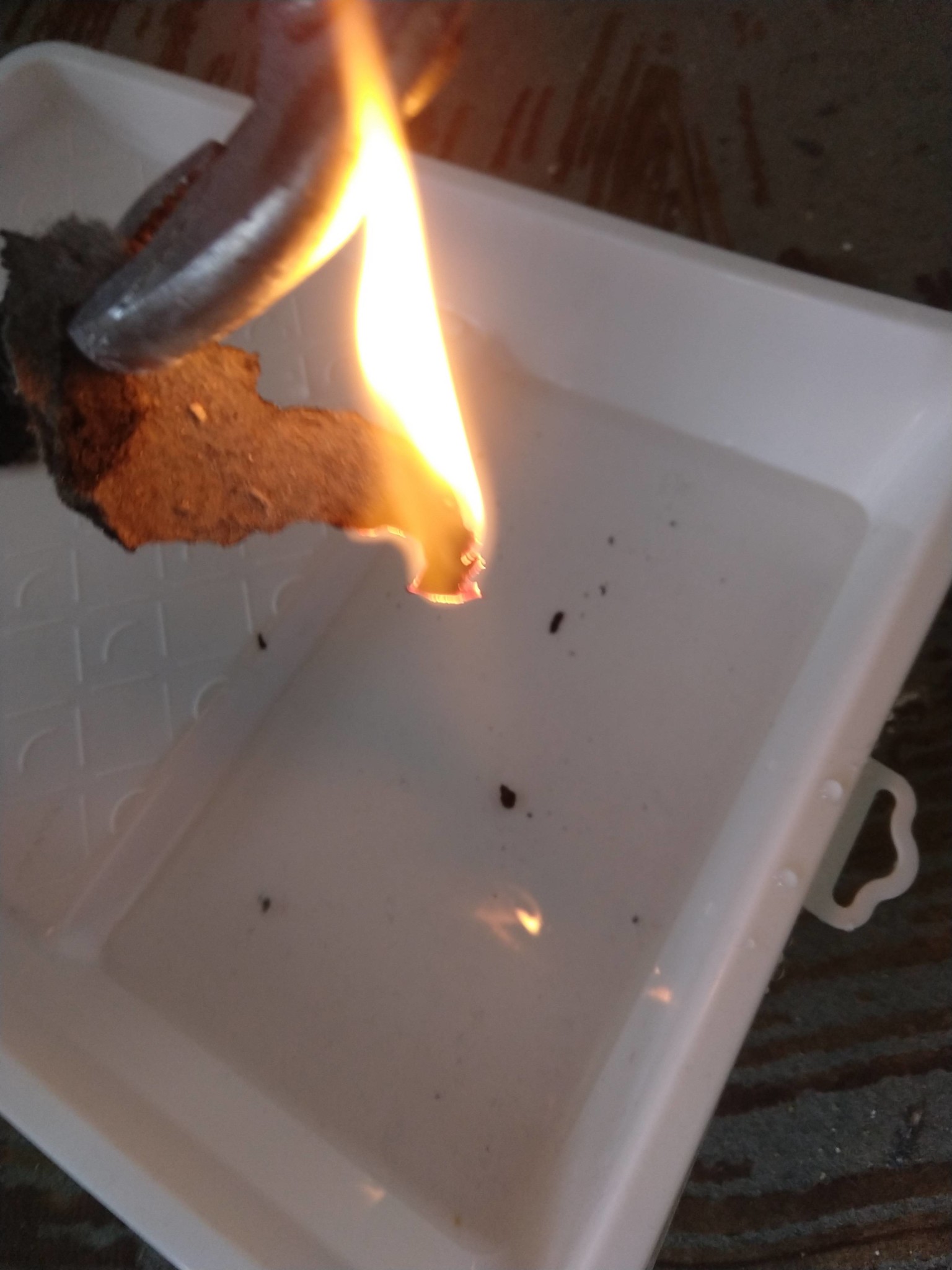 Alltså om det sticker ut fibrer på biten som man ska testa, ska man elda på fiberna, inte hela provbiten.