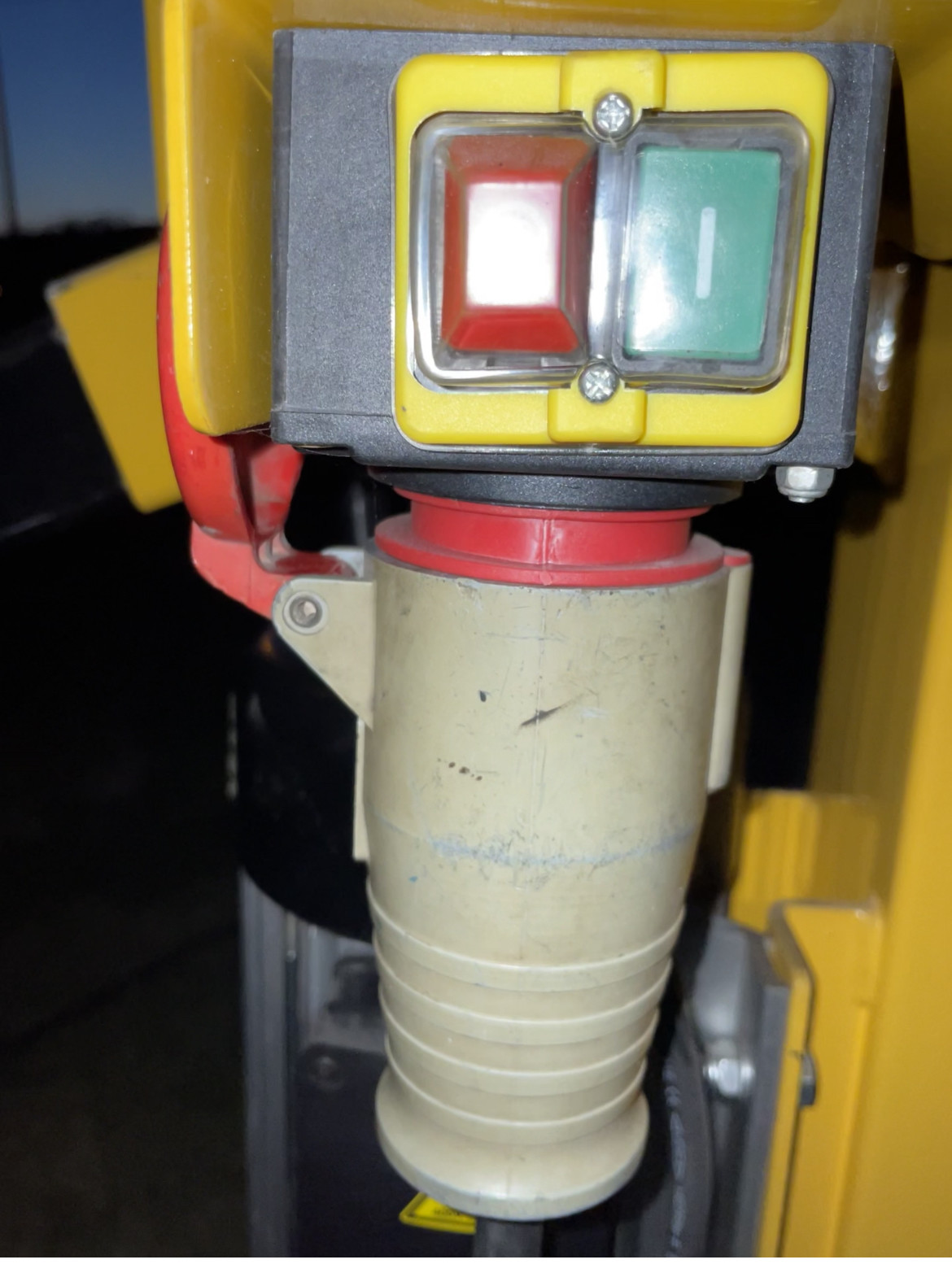Startknappen åker tillbaka när skyddet löser ut, så någon extra knapp finns inte.