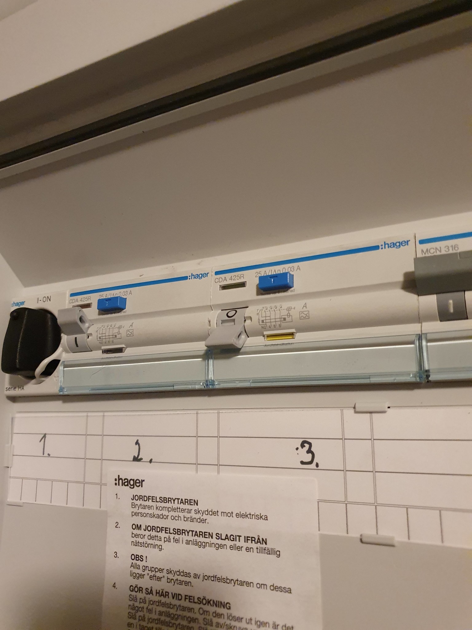 Testade att slå av och på huvudbrytaren nu men jordfelsbrytaren går fortfarande inte att slå på - varken om jag testar att trycka rakt upp eller snett uppåt. Vet inte vilket tryck man ska behöva trycka med men är ju en plastknapp så vågar inte ta i för mycket. Det finns separata brytare för cirkpump, elpatron och hydroforpump och alla har varit avslagna.