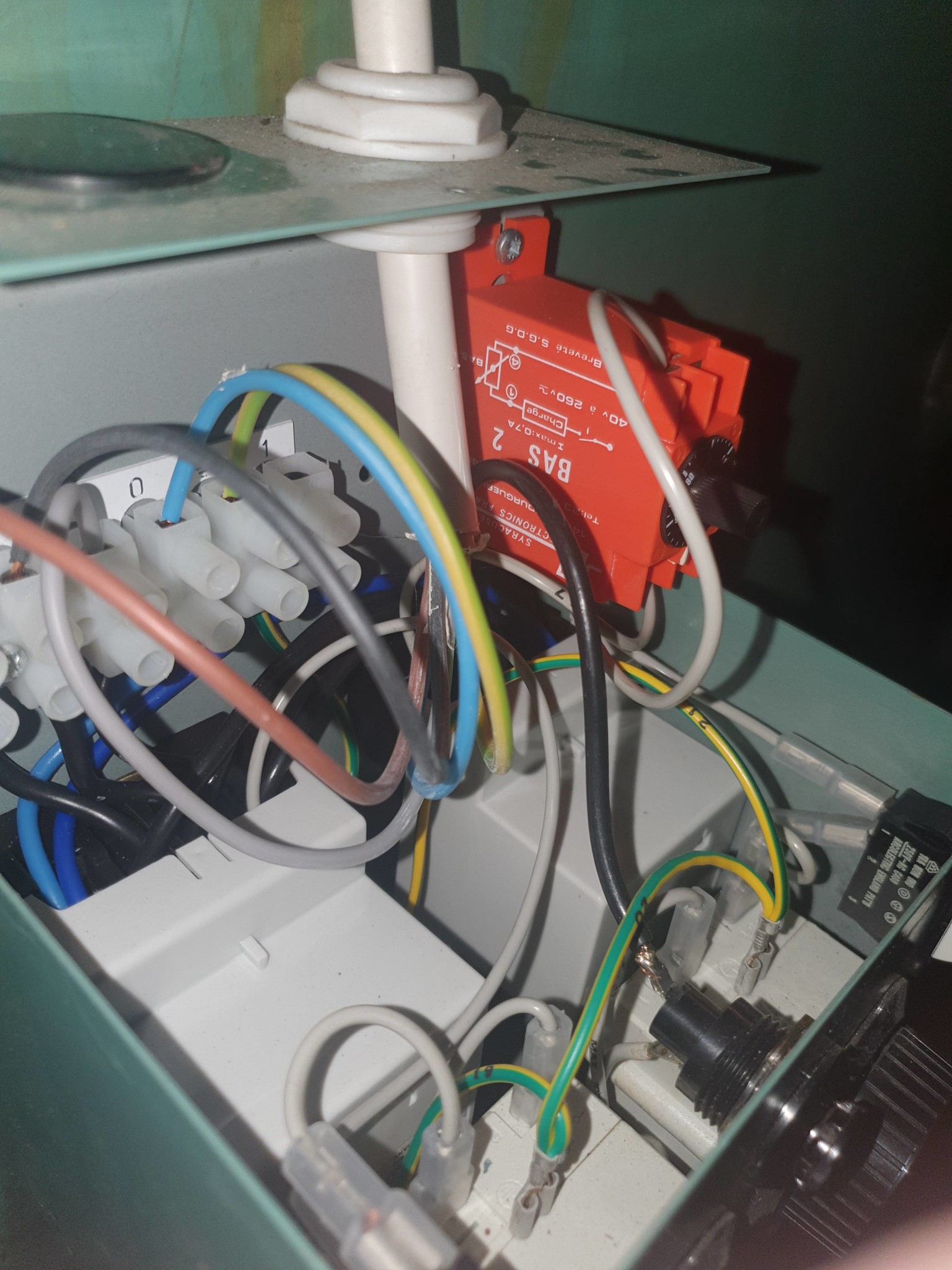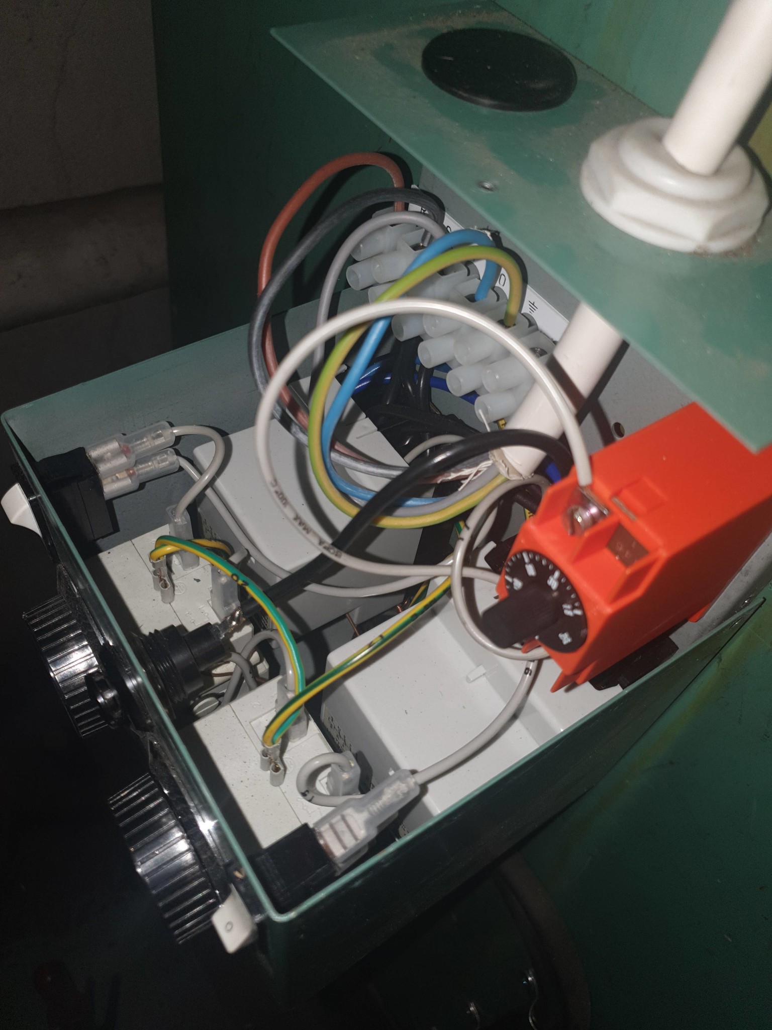 Det man kan spåra på bilderna kring kopplingen är helt enkelt två kontaktorer en för respektive patron styrda via enpoliga termostater och där högra dessutom går via tidreläet som fördröjer tillslaget. Manöverspänningen via L1 uttaget på högra kontaktorns översida och lagt via manöversäkringen "glasröret" i mitten. Sen via de små manöverbrytarna vita vipporna på vardera sidan och för vänster direkt till spolen och högra via tvåtråds "tidreläet" till den spolen.