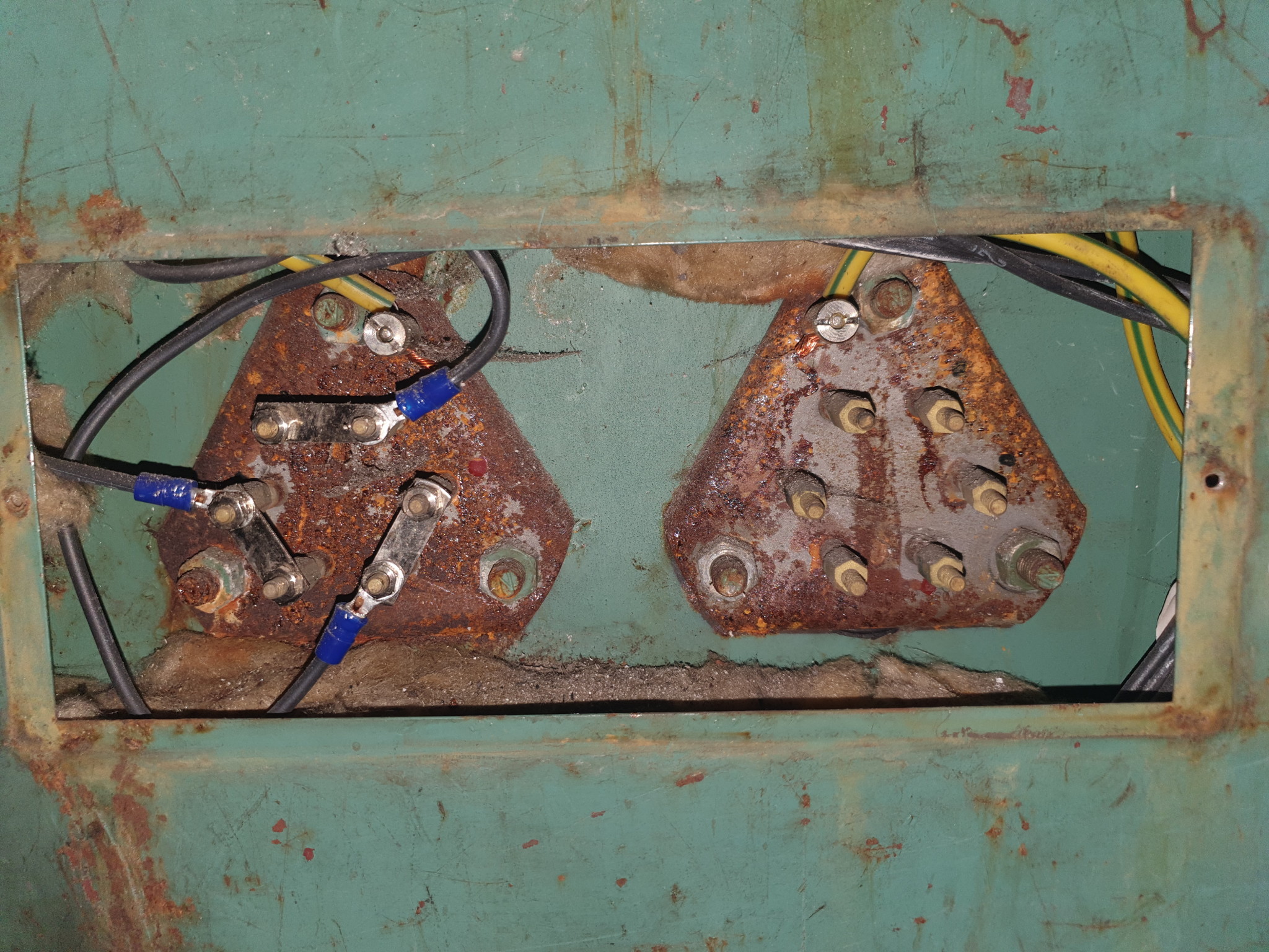 Det är bara den vänstra patronen som är inkopplad, med tre faser och jord. Så den högra har antingen aldrig använts eller blivit bortkopplad efter tidigare fel.