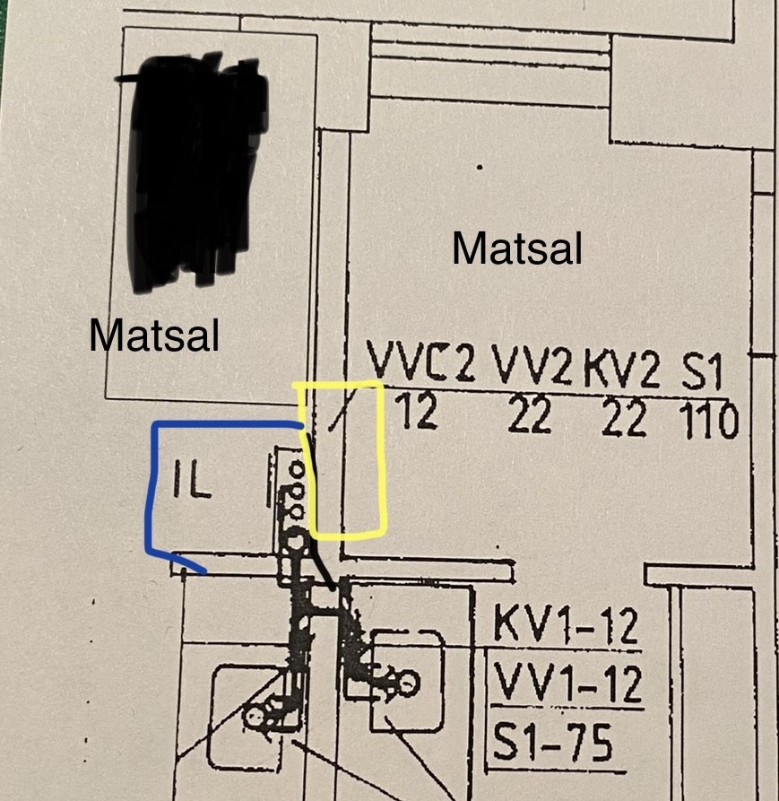 Fick en relationsritning från min nya BRF där VVS verkar vara specad. Enligt ritningen har grannen lite rör som går på andra sidan väggen där jag vill borra. Jag gick över hos grannen och den tidigare ägaren hade byggt in rören i en ”utbyggnad” enligt den blå markeringen i samband med stambyte 2002 ungefär.