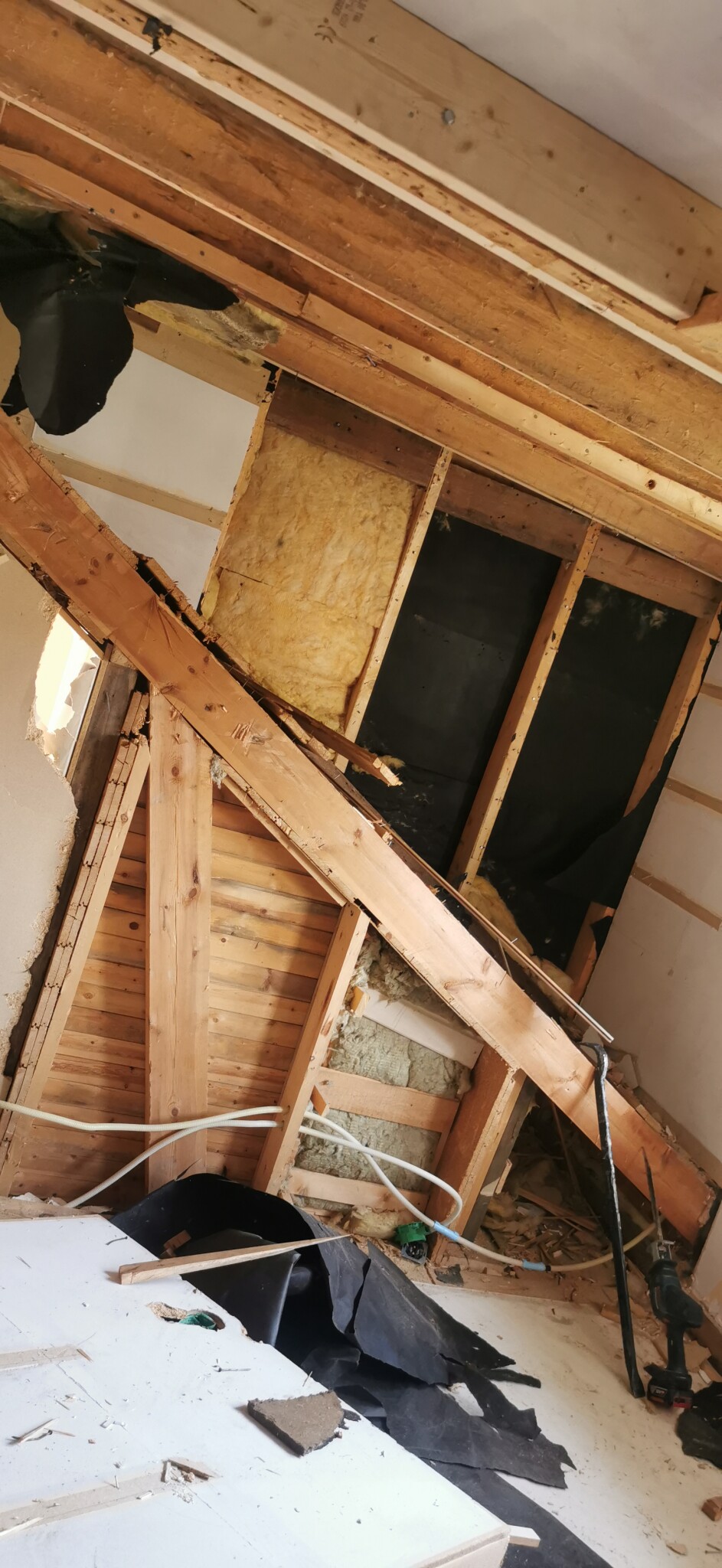 Det är ett högben till det gamla taket, som fanns innan av de jag köpte huset. Å när jag har börjat riva märkte jag att stödbenen till den hänger löst.