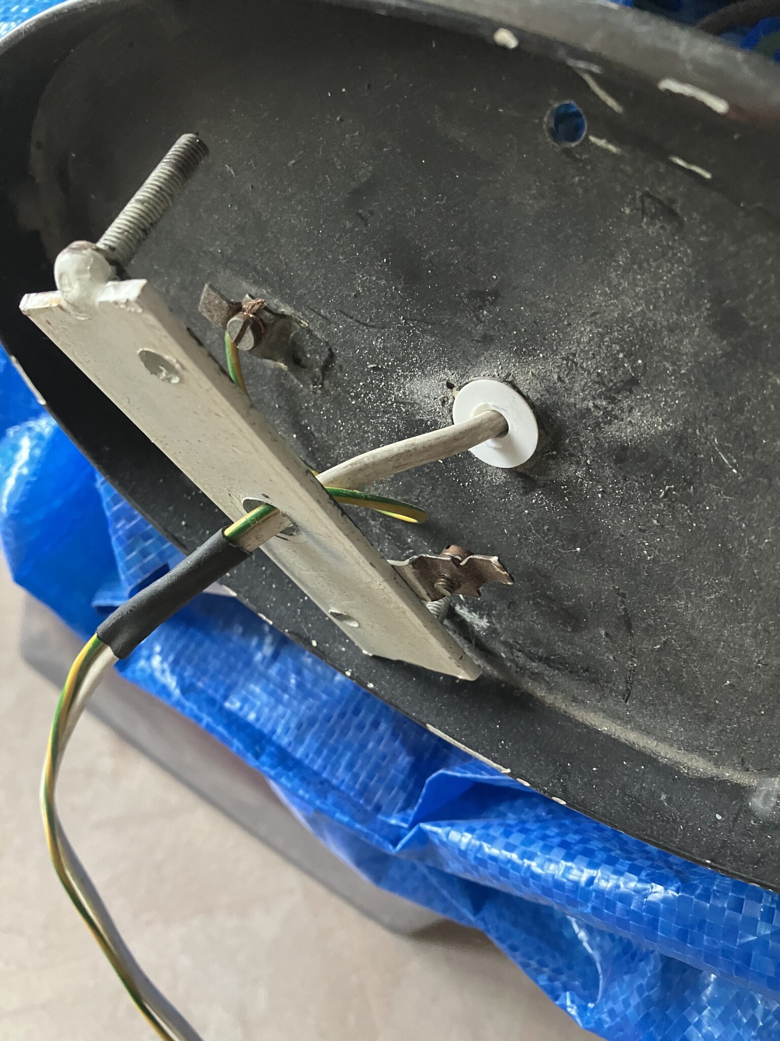 (Jag bifogar bilder på lampans sladdar samt på det ojordade uttaget för taklampan.)