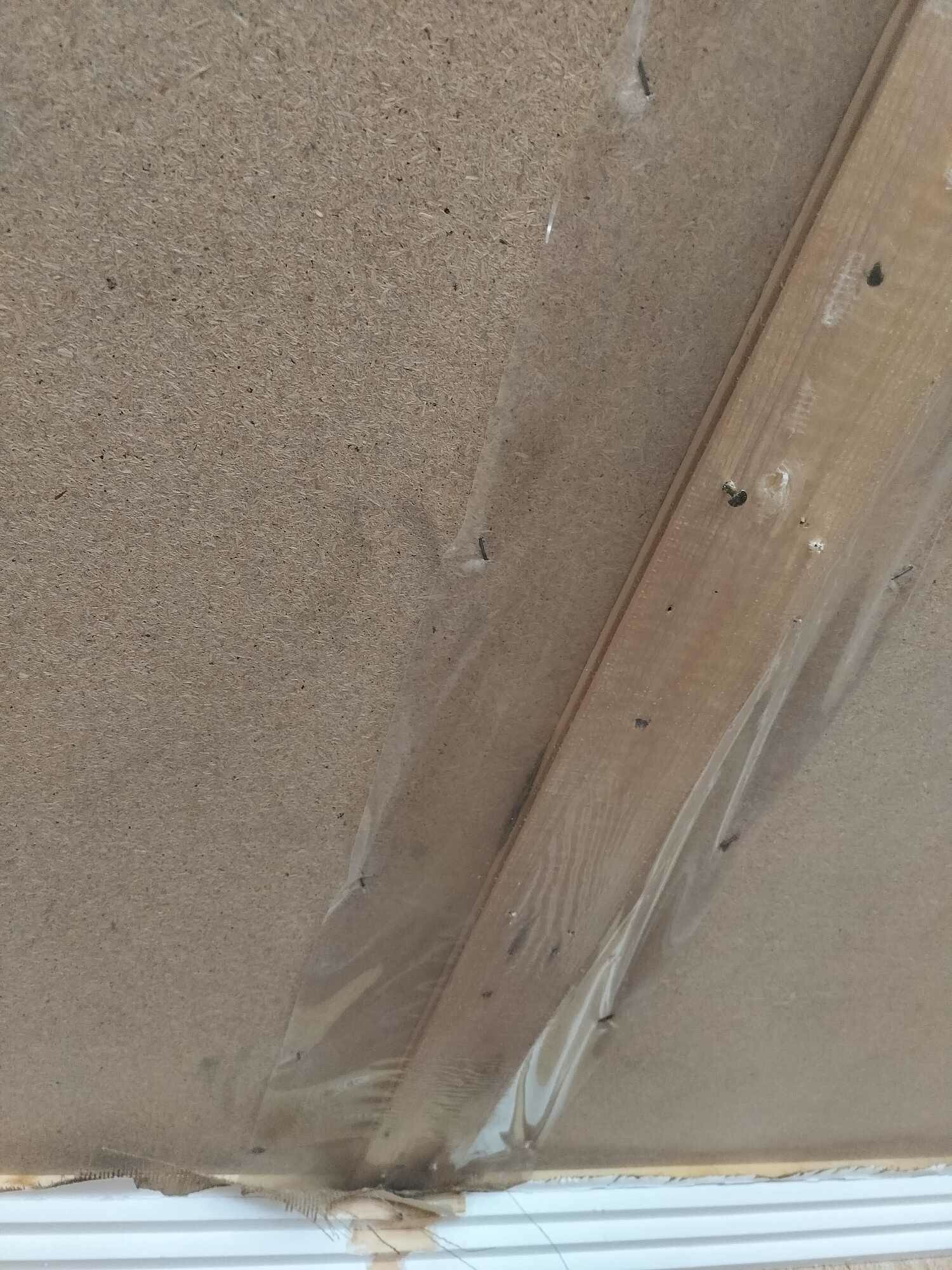 Det sitter idag glespanel spikad och limmad över alla skarvar på spånskivorna med fuktspärr över, Bifogar en bild nedan på detta.