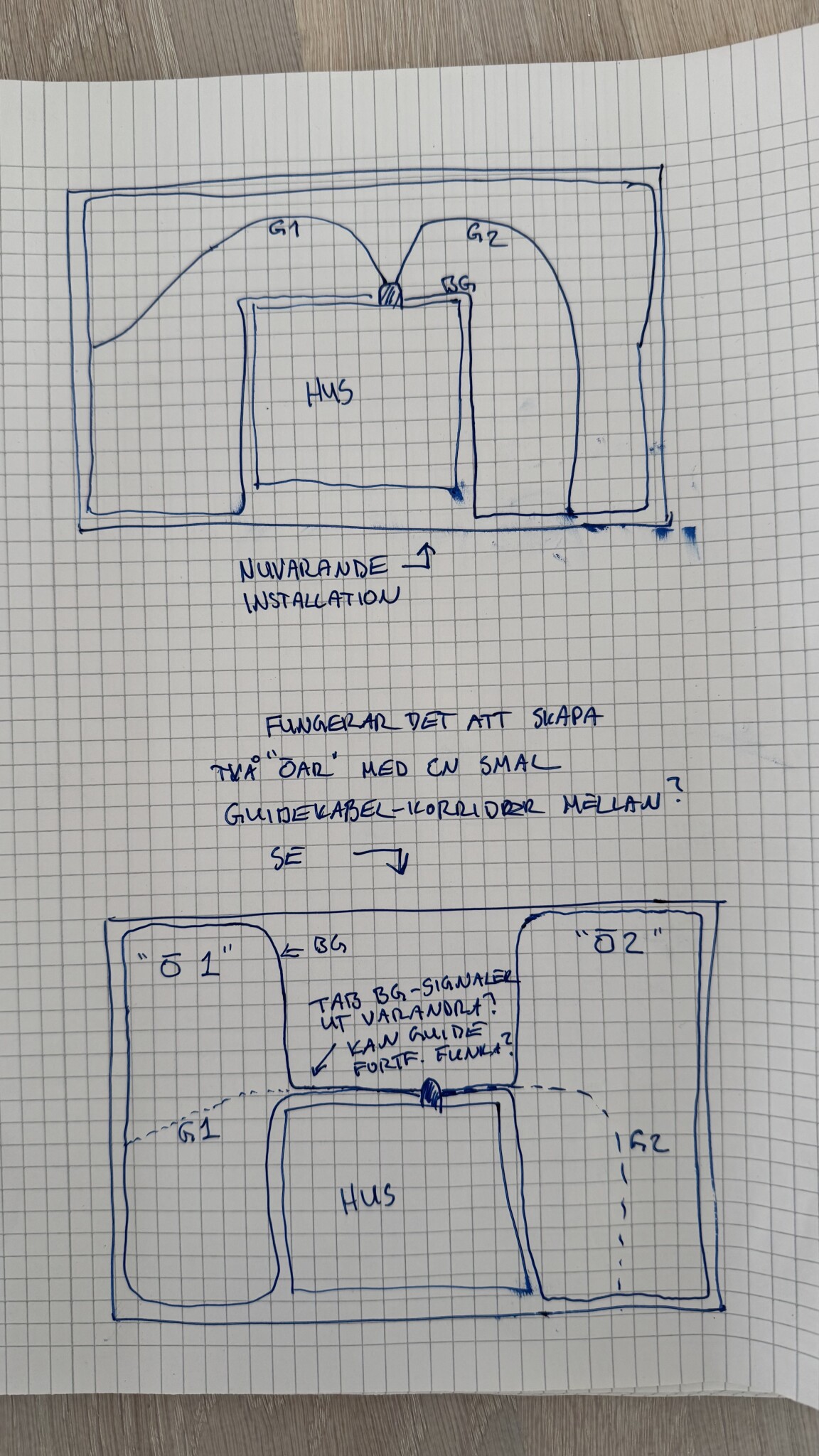 Hej - har Automower 430X m två guidekablar. Har en välfungerande installation med stor klippyta på vardera sida av huset och en smalare passage (ca 3m bred) bakom huset. Klipparen är placerad bakom huset. Av olika skäl behöver jag sluta klippa bakom huset…. Kan jag helt sonika skapa två öar på fram- och baksida och låta klipparen följa guiderna in i respektive ö? Jag tänker att klipparen då skulle köra på inne i en ö tills den behöver ladda, och då följa guiden hem. Sedan ställer jag den på 50/50 vilken guide den ska följa ut för klipp. Frågan är om någon testat låta en guidekabel löpa ihop med begränsningskablar till öar och om klipparen klarar av att känna guidesignalen? Jag vet att rekommenderat minsta avstånd är 30 cm från BG till guide…åtminstone om man vill klippa ytan. Tankar och svar om ni testat välkomnas. Förenklad bild nedan. Tack.