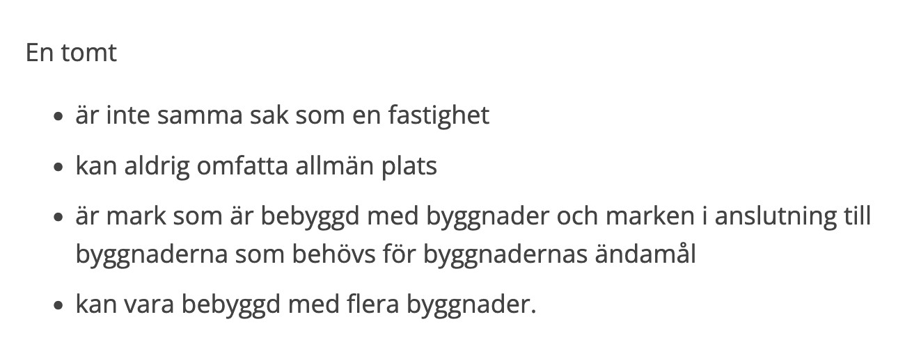 "tomt: ett område som inte är en allmän plats men som omfattar mark avsedd för en eller flera byggnader och mark som ligger i direkt anslutning till byggnaderna och behövs för att byggnaderna ska kunna användas för avsett ändamål,"