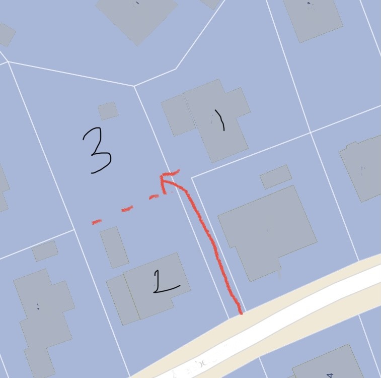 Håller med föregående talare. Om 2 ska lyckas stycka av ska det självklart gå att ta sig till 3 utan att använda någon annans tomt. 2 kan stycka av en skaftgata likt den 1 har så att 3 får en egen sådan, parallellt med 1:s, eller så kan 2 upprätta ett servitut över sin egen tomt.