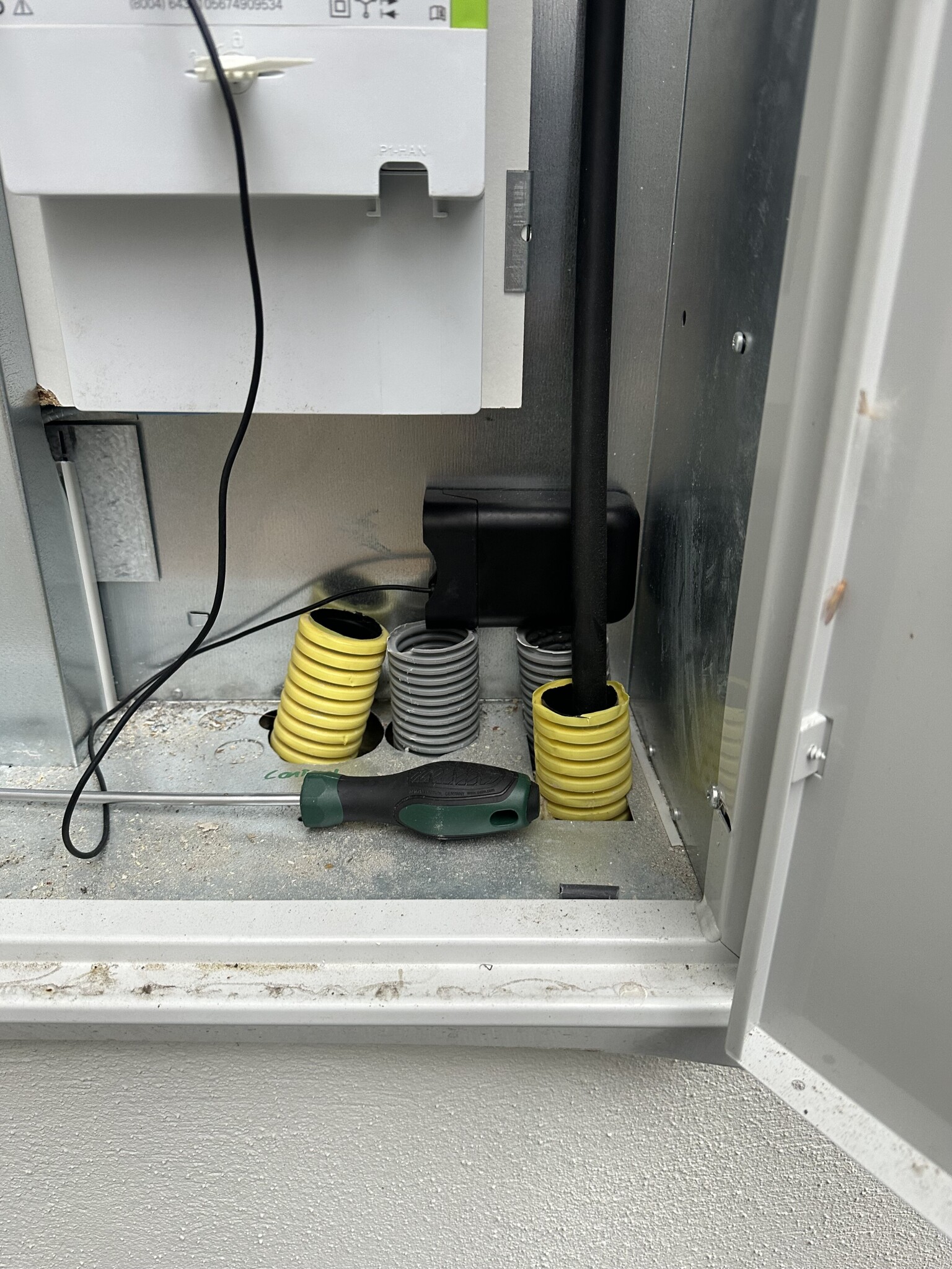 Grått rör till elcentral inne, gult rör till kabelbrunn utomhus, där kabeln sen kan komma vidare i ett annat gulrör.